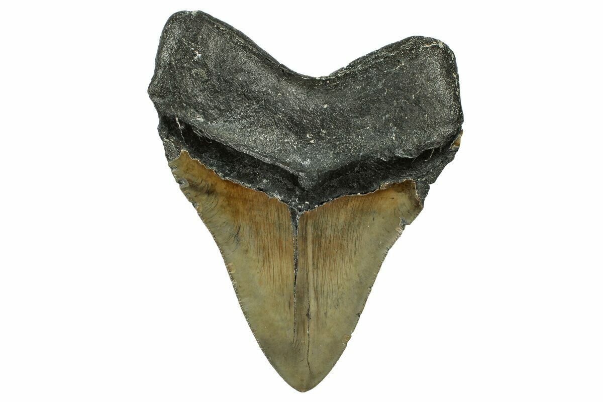 The standard measure for megalodon teeth is slant height, or the longest edge of the tooth. Adult megalodon teeth were typically in the 4 to 5 inch range: teeth over 6 inches are rare and represent super-sized individuals. Only a handful of teeth have ever been found over seven inches.