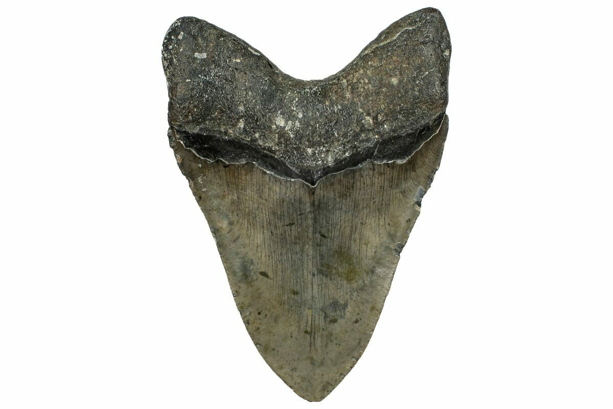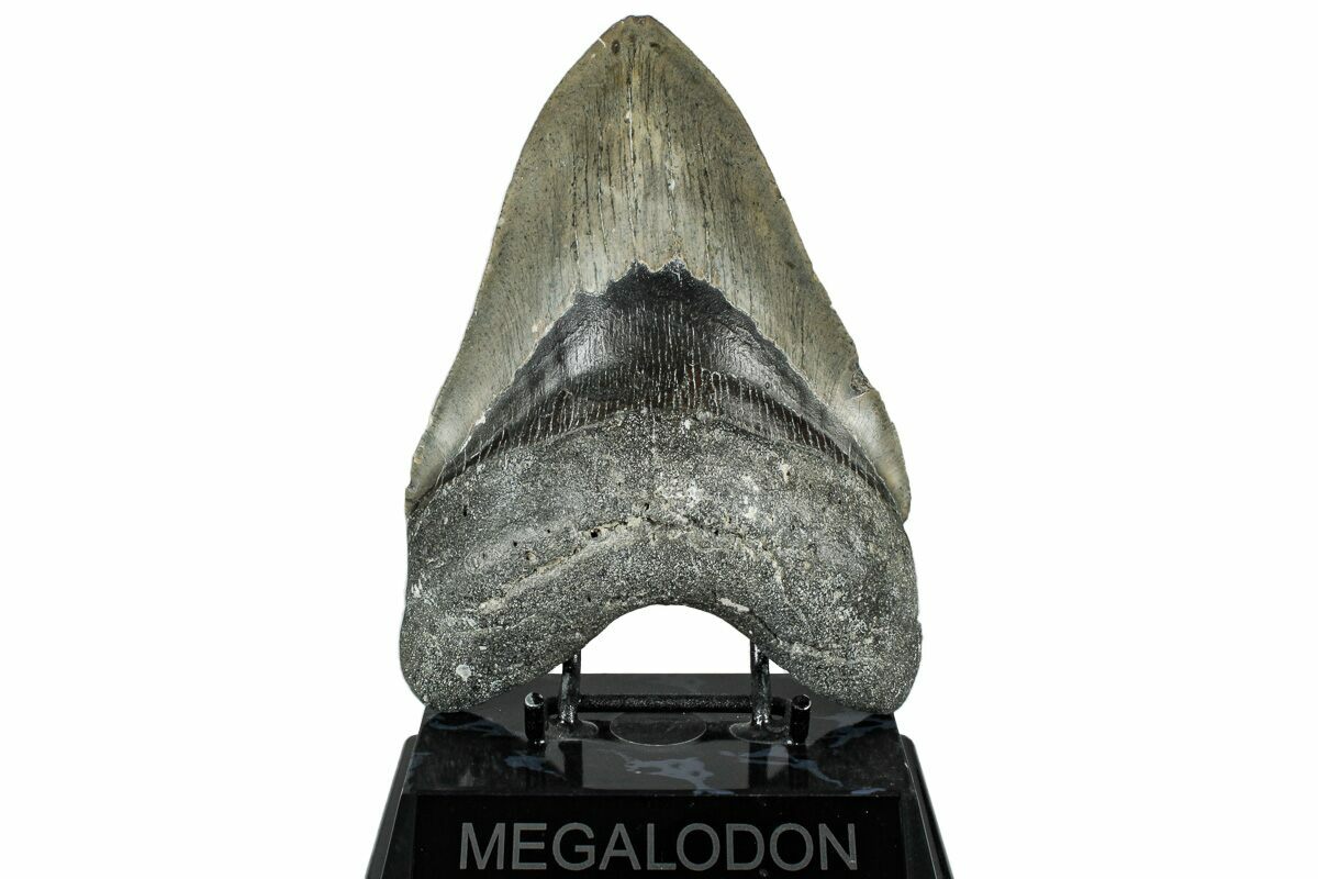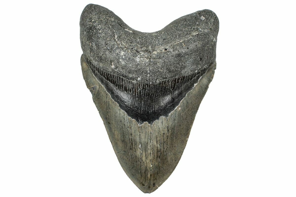 The standard measure for megalodon teeth is slant height, or the longest edge of the tooth. Adult megalodon teeth were typically in the 4 to 5 inch range: teeth over 6 inches are rare and represent super-sized individuals. Only a handful of teeth have ever been found over seven inches.