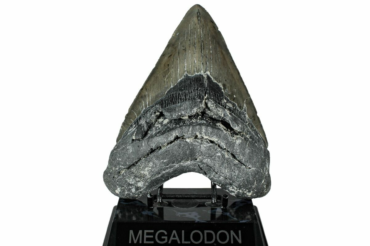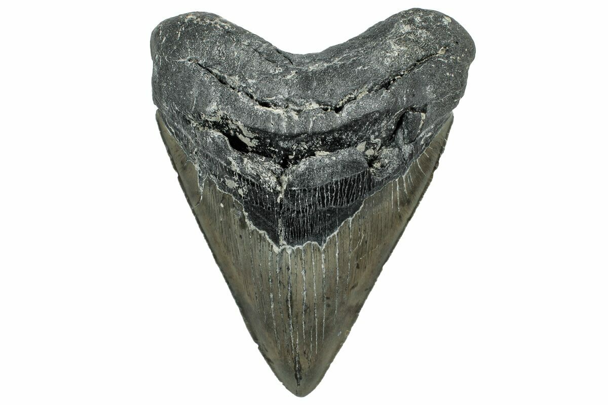 The standard measure for megalodon teeth is slant height, or the longest edge of the tooth. Adult megalodon teeth were typically in the 4 to 5 inch range: teeth over 6 inches are rare and represent super-sized individuals. Only a handful of teeth have ever been found over seven inches.