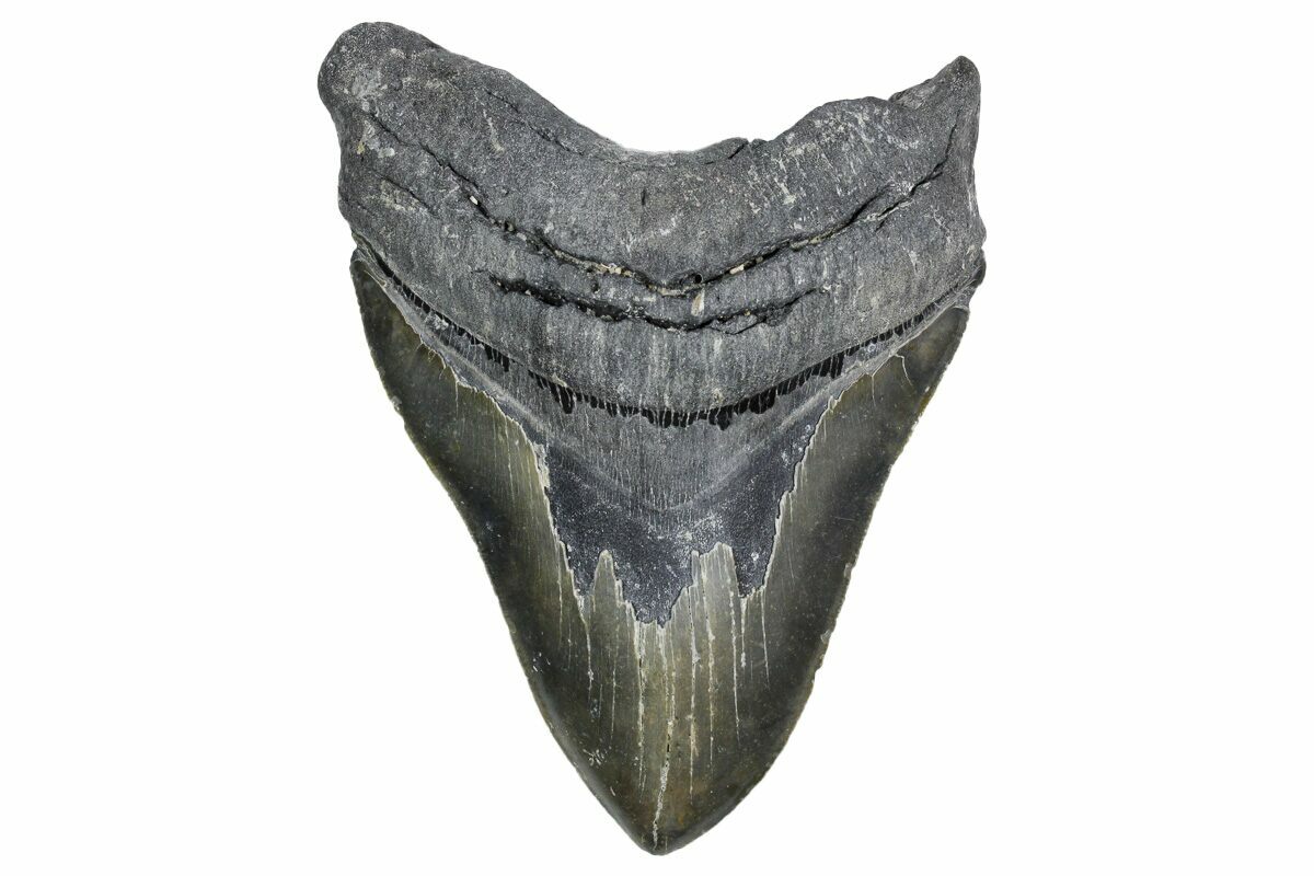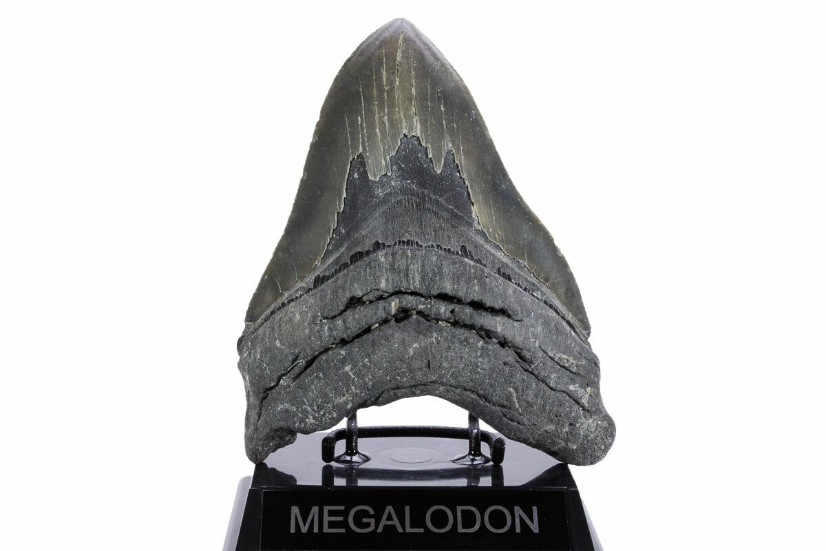 The standard measure for megalodon teeth is slant height, or the longest edge of the tooth. Adult megalodon teeth were typically in the 4 to 5 inch range: teeth over 6 inches are rare and represent super-sized individuals. Only a handful of teeth have ever been found over seven inches.