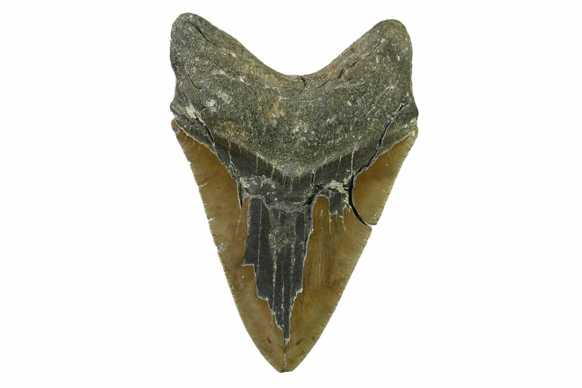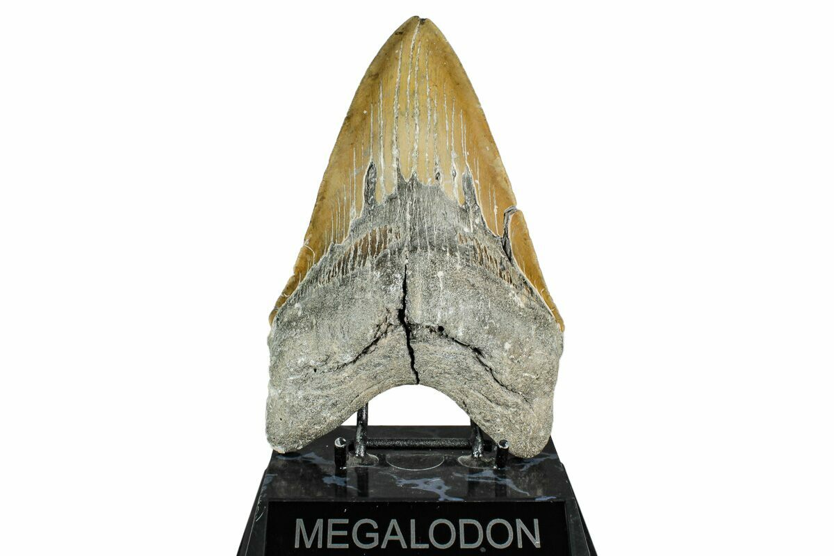 The standard measure for megalodon teeth is slant height, or the longest edge of the tooth. Adult megalodon teeth were typically in the 4 to 5 inch range: teeth over 6 inches are rare and represent super-sized individuals. Only a handful of teeth have ever been found over seven inches.