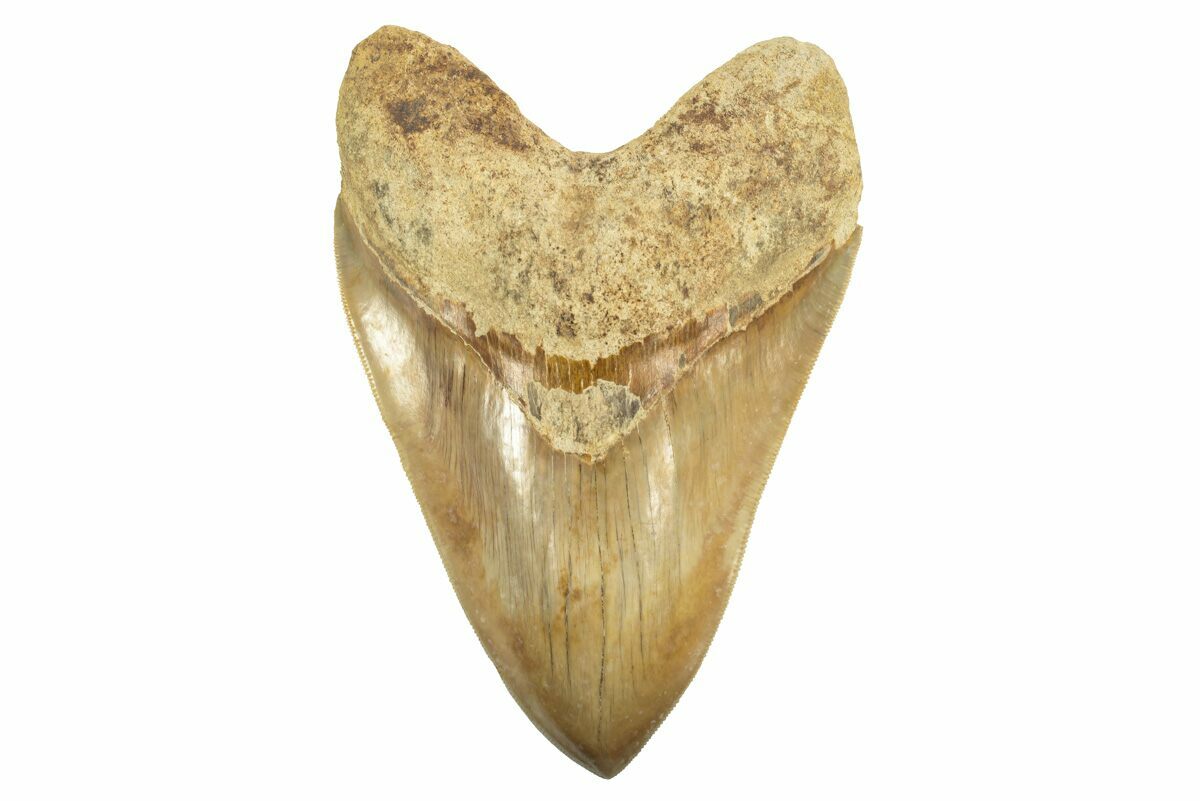The standard measure for megalodon teeth is slant height, or the longest edge of the tooth. Adult megalodon teeth were typically in the 4 to 5 inch range: teeth over 6 inches are rare and represent super-sized individuals. Only a handful of teeth have ever been found over seven inches.