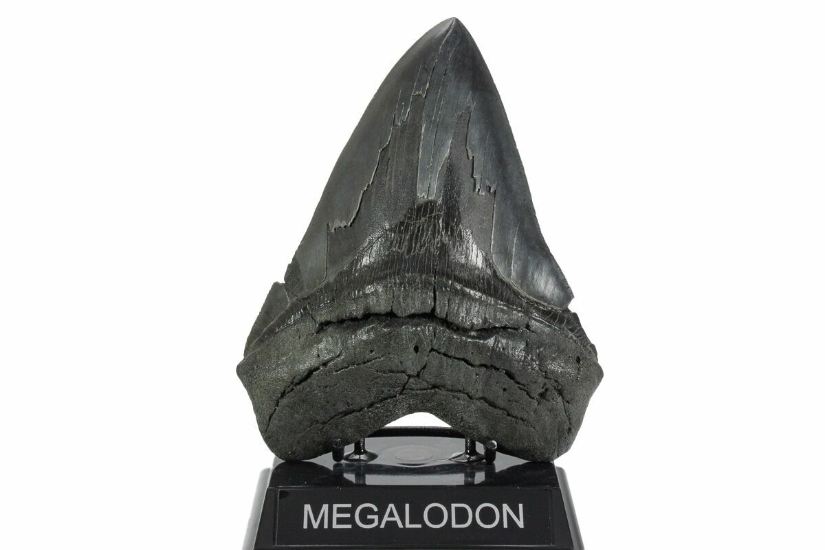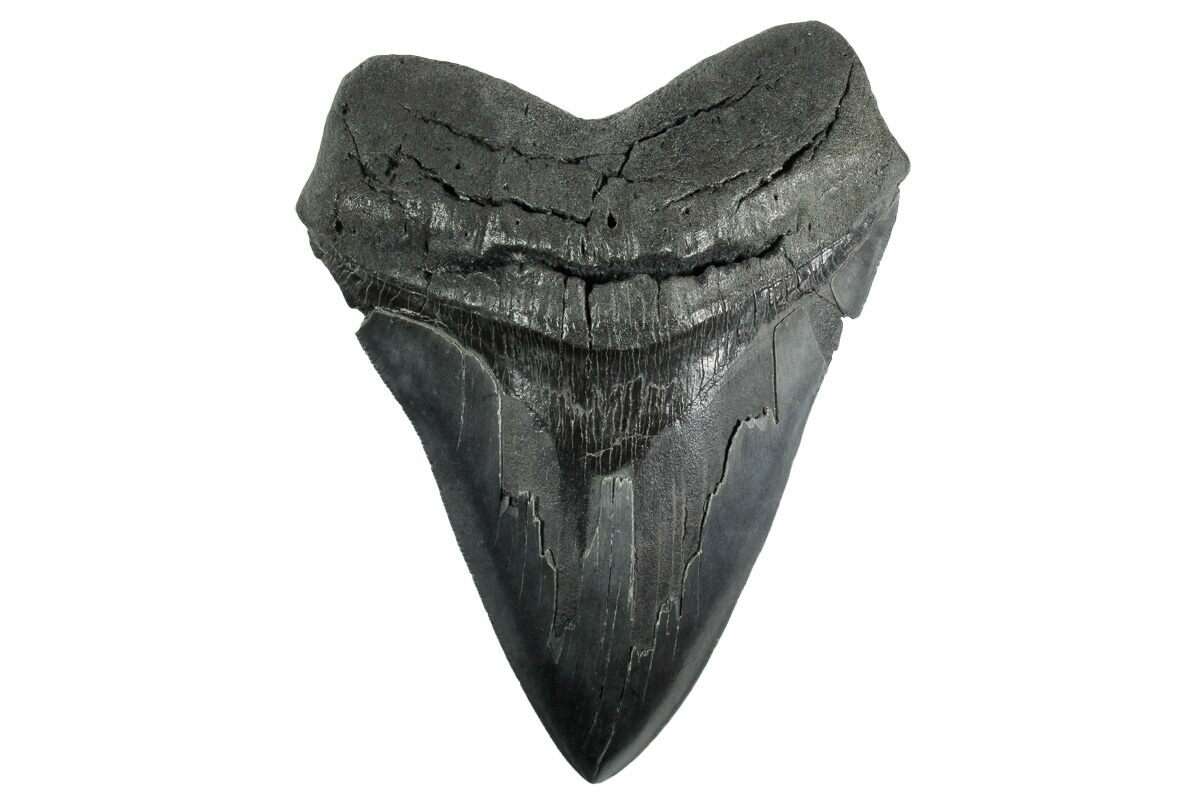 The standard measure for megalodon teeth is slant height, or the longest edge of the tooth. Adult megalodon teeth were typically in the 4 to 5 inch range: teeth over 6 inches are rare and represent super-sized individuals. Only a handful of teeth have ever been found over seven inches.