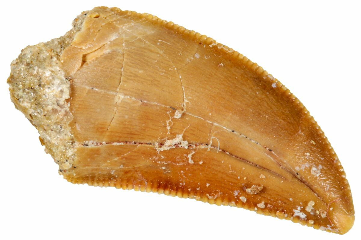 This is an authentic dinosaur tooth from the Late Cretaceous Kem Kem Beds (formerly Tegana Formation) of Morocco. These small theropod dinosaurs from the Tegana Formation have yet to be described, primarily due to a lack of articulated bone material found in the formation. That means it is impossible to provide a species or even genus ID from these teeth alone.