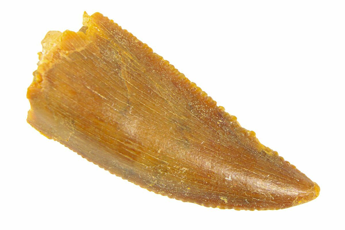 This is an authentic dinosaur tooth from the Late Cretaceous Kem Kem Beds (formerly Tegana Formation) of Morocco. These small theropod dinosaurs from the Tegana Formation have yet to be described, primarily due to a lack of articulated bone material found in the formation. That means it is impossible to provide a species or even genus ID from these teeth alone.