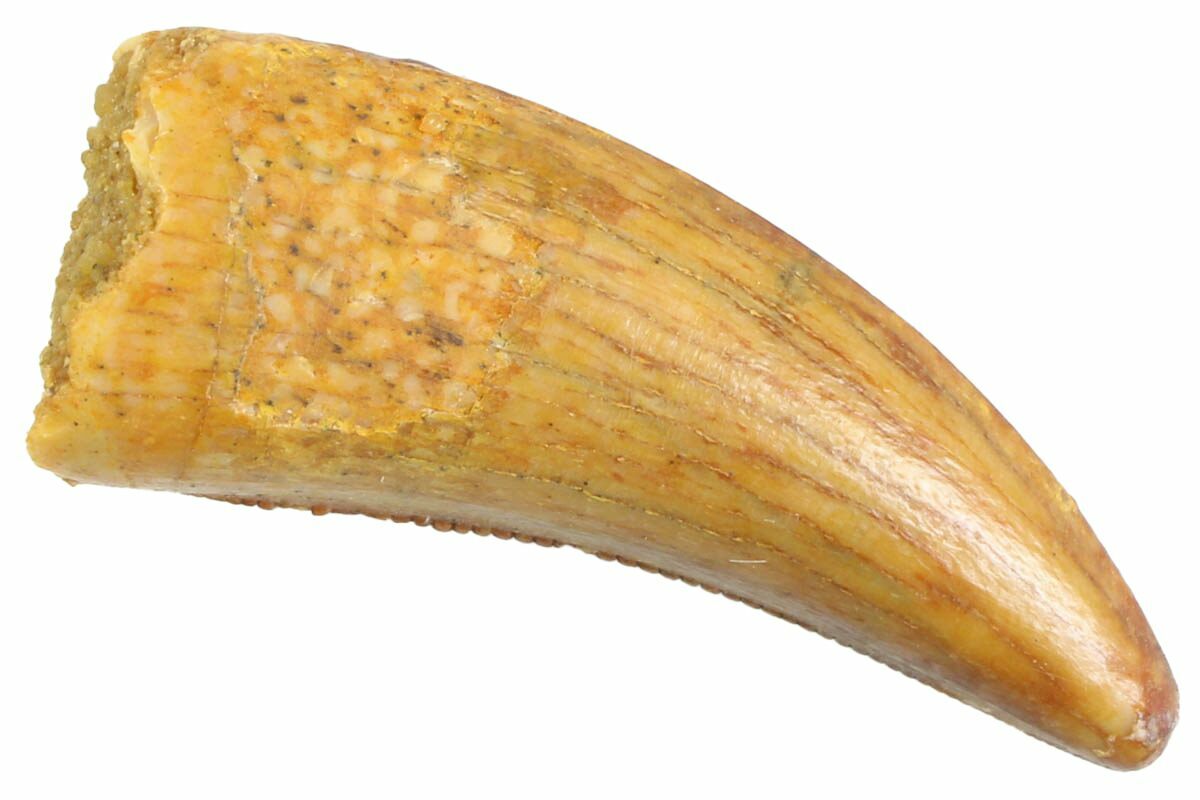 This type of tooth has a unique morphotype rarely found in the Kem Kem deposits. They usually measure between .5" and 1" long, have prominent serrations along the distal carinae, small serrations that are typically worn along the mesial carinae, and a very round base. The mid-line of their distal edge often contains an average of 14 to 17 serrations per 5mm, varying based on size of the tooth.