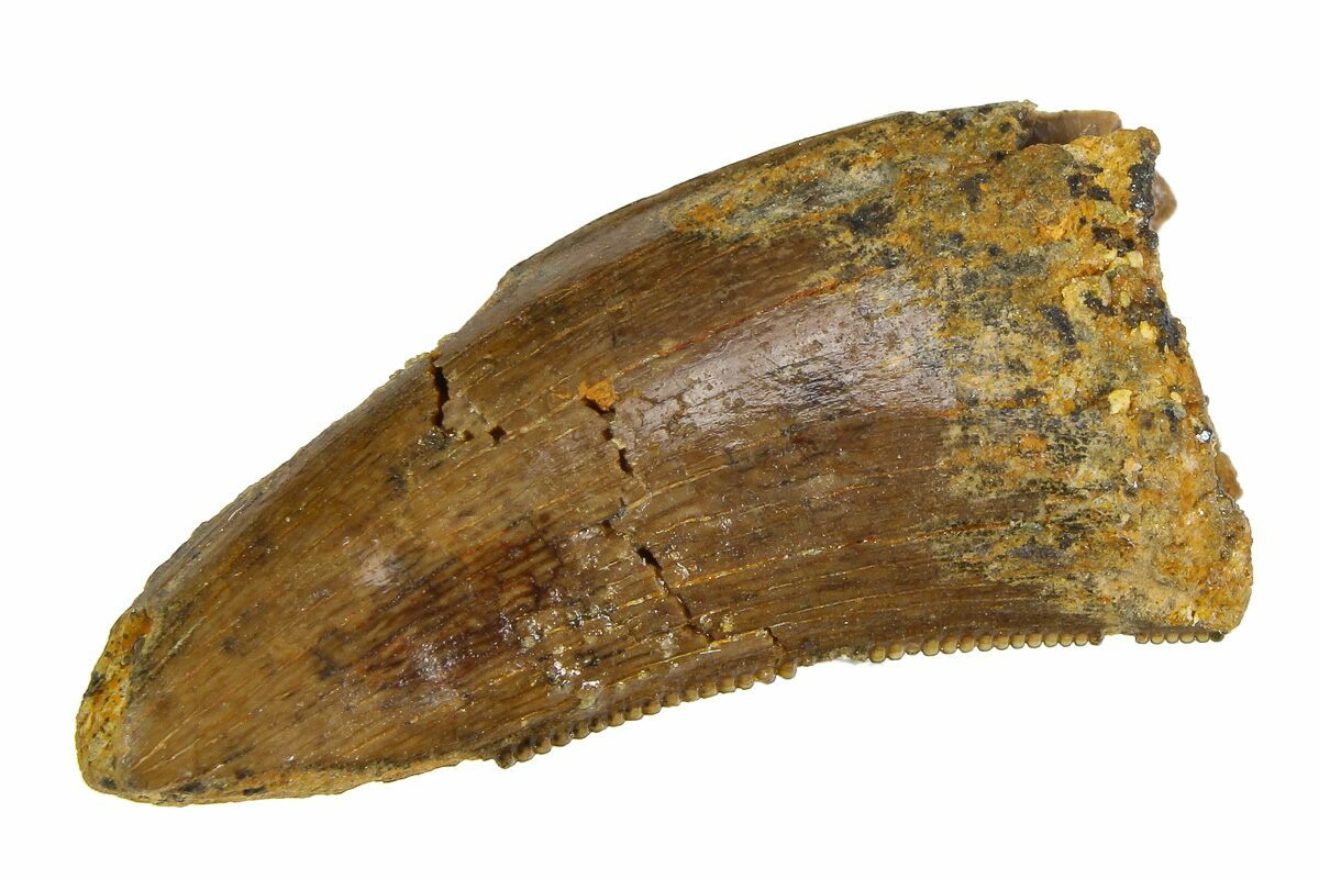 This is a .72" long tyrannosaur tooth from the genus Nanotyrannus, collected from the Hell Creek Formation in Montana. There is feeding wear/damage at the tip and a repaired crack through the crown, but the tooth retains visible serrations and offers an affordable opportunity to own a genuine specimen from this intriguing tyrannosaur.