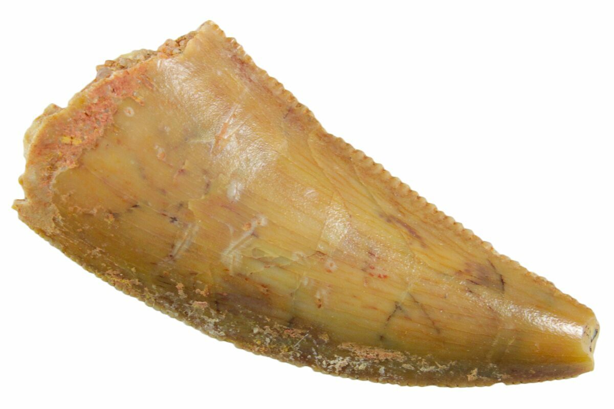 This is an authentic dinosaur tooth from the Late Cretaceous Kem Kem Beds (formerly Tegana Formation) of Morocco. These small theropod dinosaurs from the Tegana Formation have yet to be described, primarily due to a lack of articulated bone material found in the formation. That means it is impossible to provide a species or even genus ID from these teeth alone.