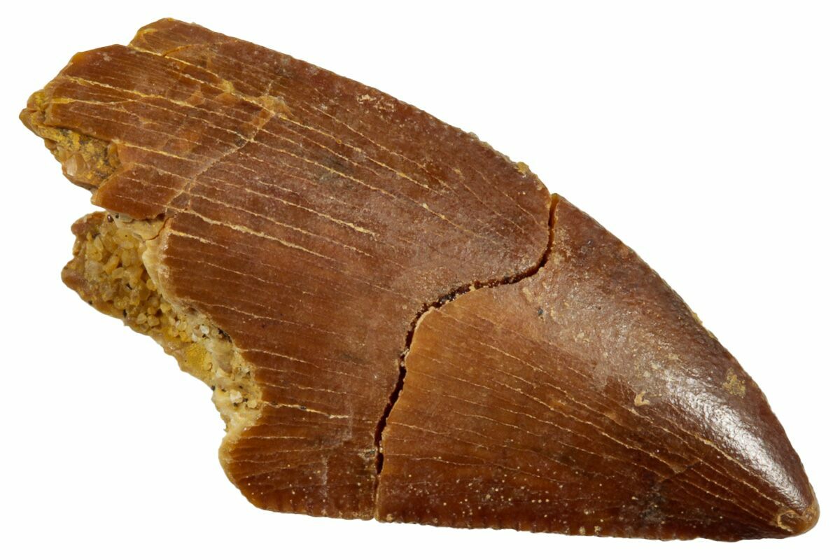 This is an authentic dinosaur tooth from the Late Cretaceous Kem Kem Beds (formerly Tegana Formation) of Morocco. These small theropod dinosaurs from the Tegana Formation have yet to be described, primarily due to a lack of articulated bone material found in the formation. That means it is impossible to provide a species or even genus ID from these teeth alone.