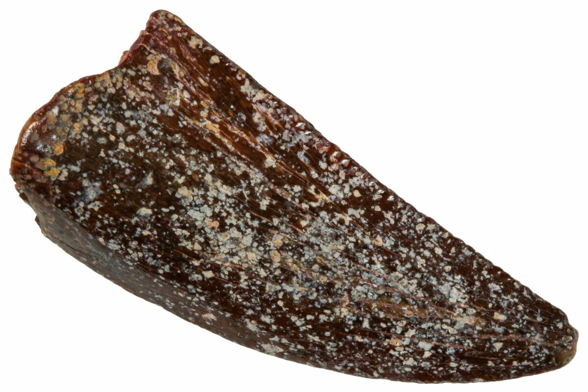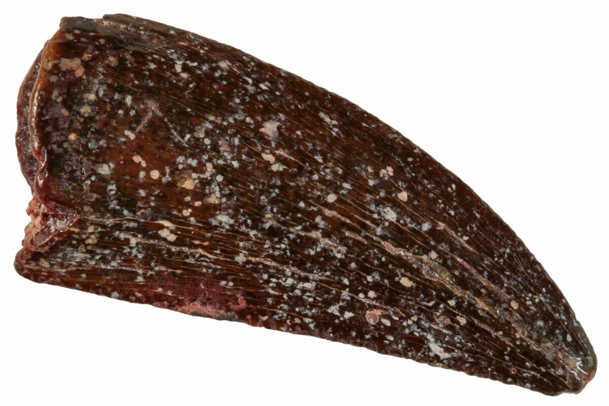 This is an authentic dinosaur tooth from the Late Cretaceous Kem Kem Beds (formerly Tegana Formation) of Morocco. These small theropod dinosaurs from the Tegana Formation have yet to be described, primarily due to a lack of articulated bone material found in the formation. That means it is impossible to provide a species or even genus ID from these teeth alone.