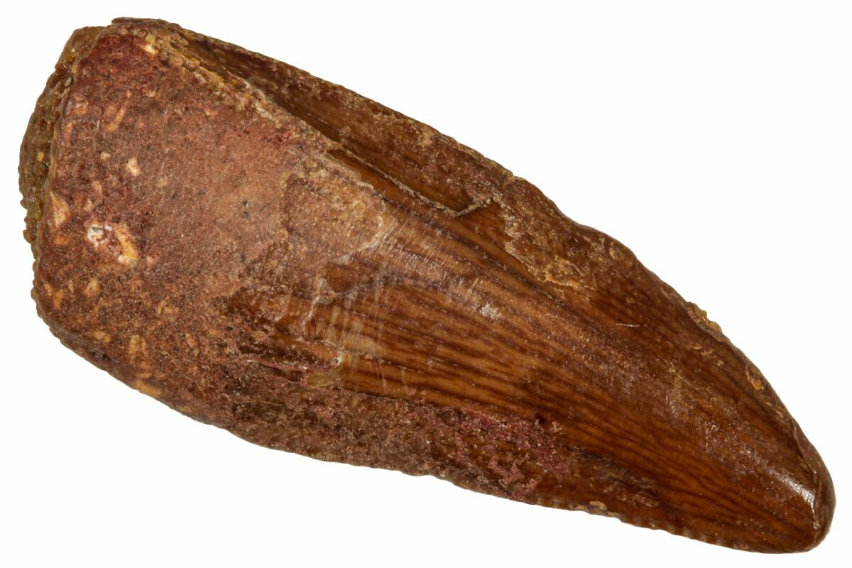 This is an authentic dinosaur tooth from the Late Cretaceous Kem Kem Beds (formerly Tegana Formation) of Morocco. These small theropod dinosaurs from the Tegana Formation have yet to be described, primarily due to a lack of articulated bone material found in the formation. That means it is impossible to provide a species or even genus ID from these teeth alone.