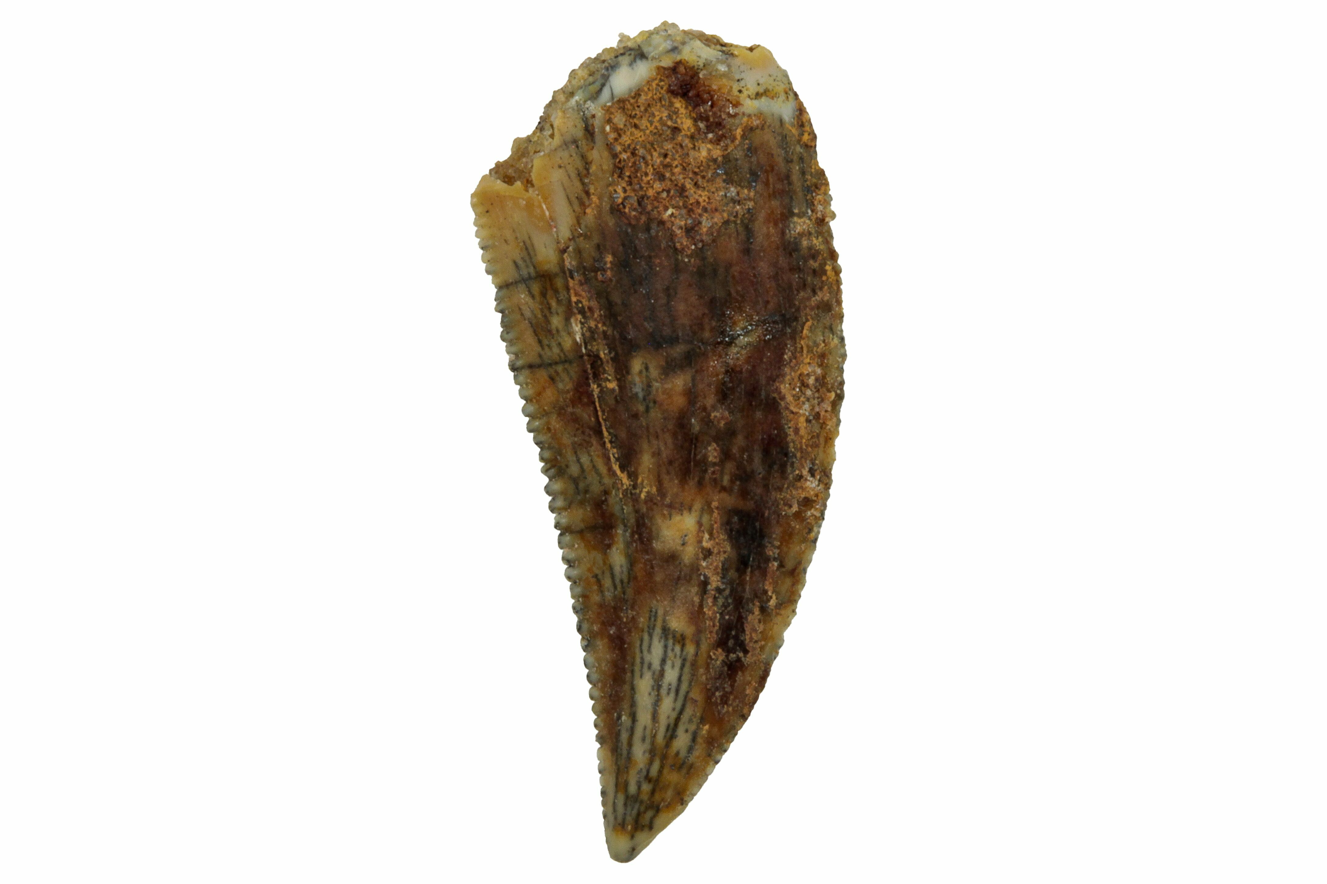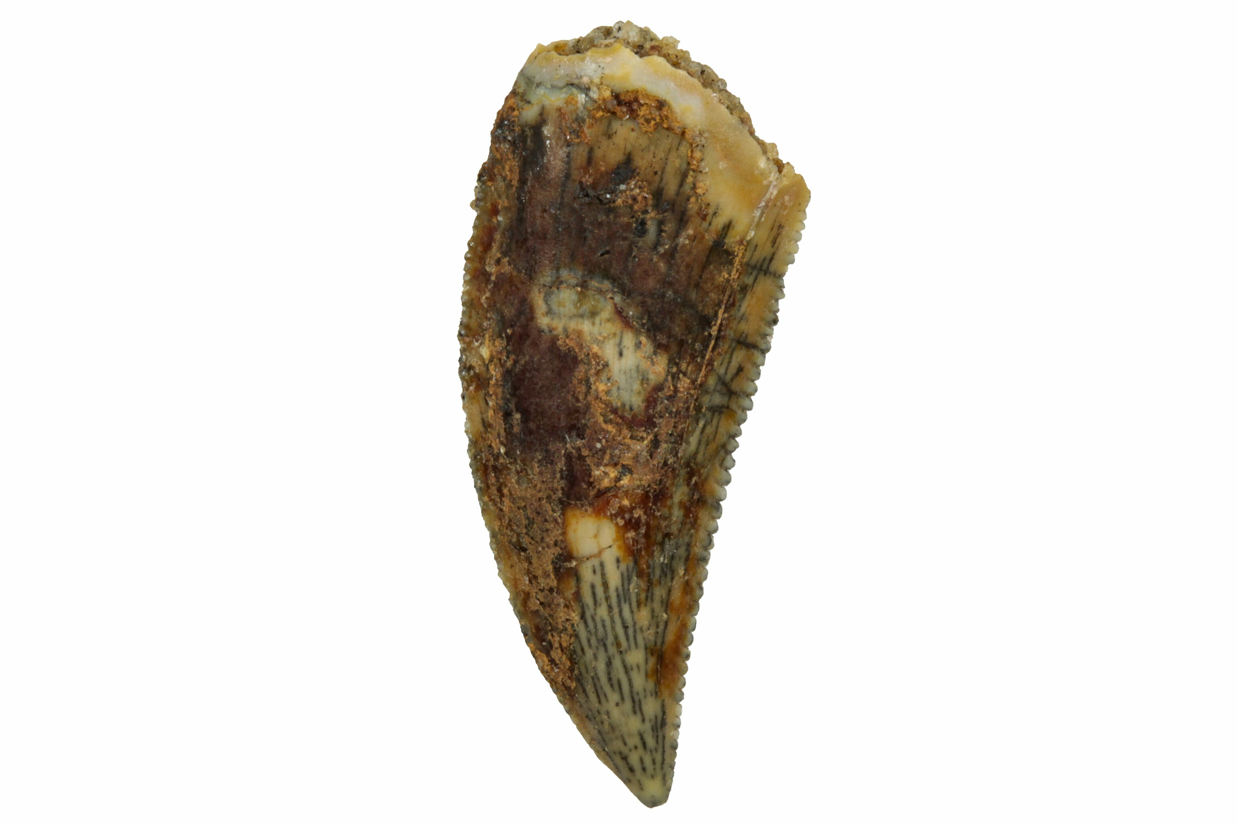 This is an authentic dinosaur tooth from the Late Cretaceous Kem Kem Beds (formerly Tegana Formation) of Morocco. These small theropod dinosaurs from the Tegana Formation have yet to be described, primarily due to a lack of articulated bone material found in the formation. That means it is impossible to provide a species or even genus ID from these teeth alone.
