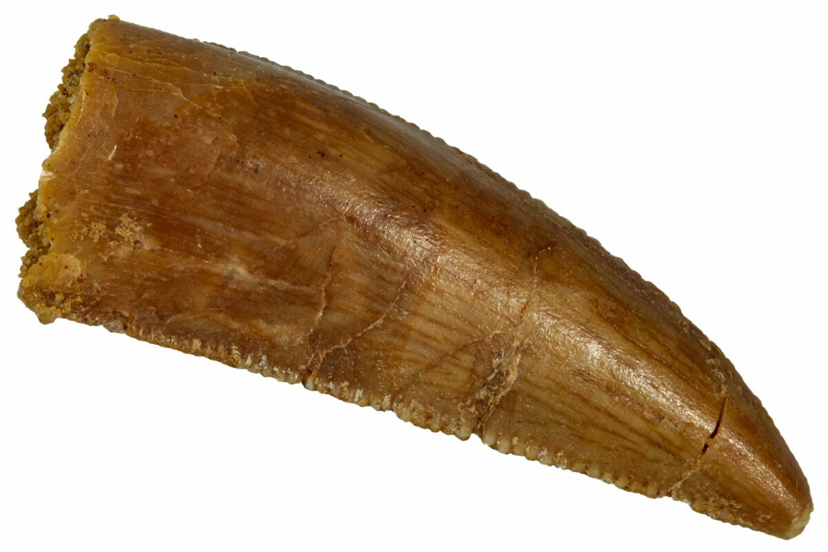 This is an authentic dinosaur tooth from the Late Cretaceous Kem Kem Beds (formerly Tegana Formation) of Morocco. These small theropod dinosaurs from the Tegana Formation have yet to be described, primarily due to a lack of articulated bone material found in the formation. That means it is impossible to provide a species or even genus ID from these teeth alone.