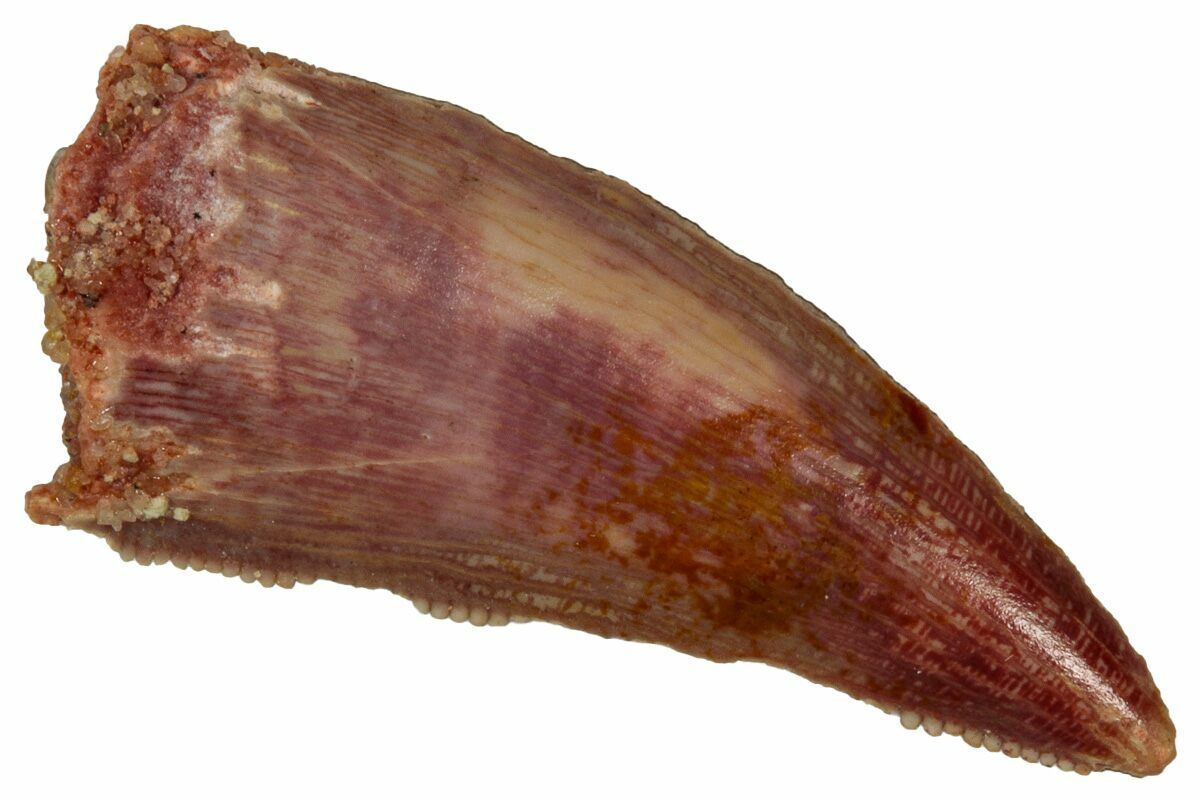This is an authentic dinosaur tooth from the Late Cretaceous Kem Kem Beds (formerly Tegana Formation) of Morocco. These small theropod dinosaurs from the Tegana Formation have yet to be described, primarily due to a lack of articulated bone material found in the formation. That means it is impossible to provide a species or even genus ID from these teeth alone.