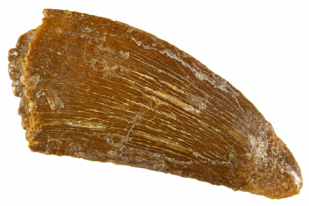 This is an authentic dinosaur tooth from the Late Cretaceous Kem Kem Beds (formerly Tegana Formation) of Morocco. These small theropod dinosaurs from the Tegana Formation have yet to be described, primarily due to a lack of articulated bone material found in the formation. That means it is impossible to provide a species or even genus ID from these teeth alone.