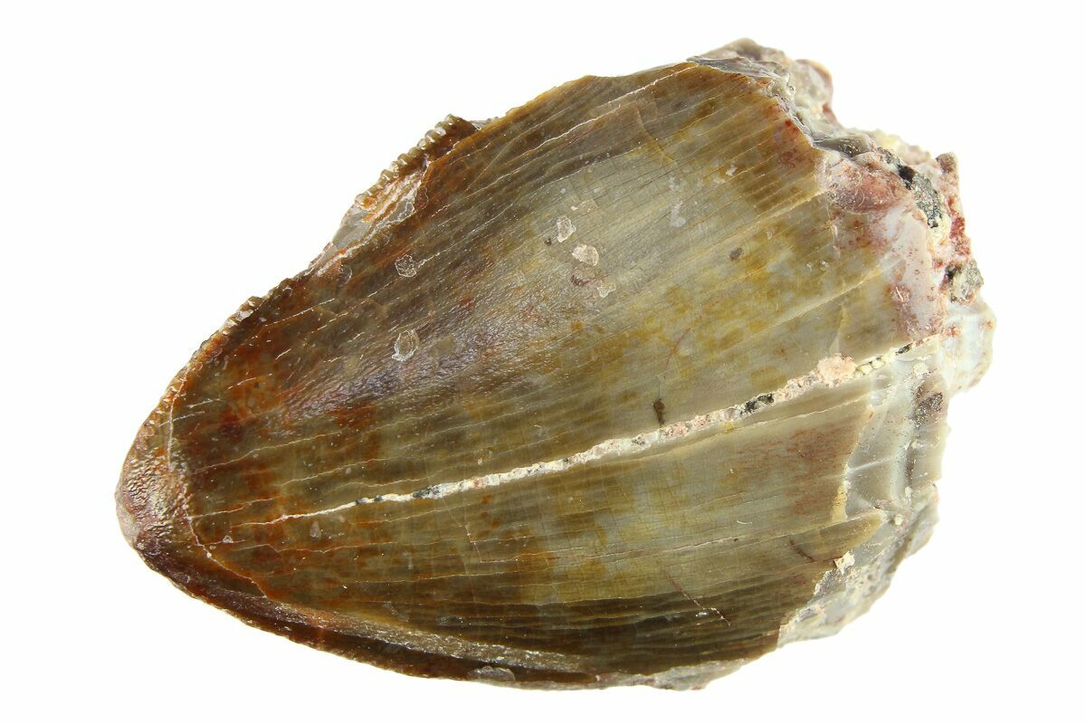 This is an exciting, .90" serrated phytosaur (Redondasaurus gregorii) tooth that was collected from the Bull Canyon Formation of New Mexico. There are spots of well preserved serrations present along both edges of the tooth. Chipping can be found at the tip and along each edge.