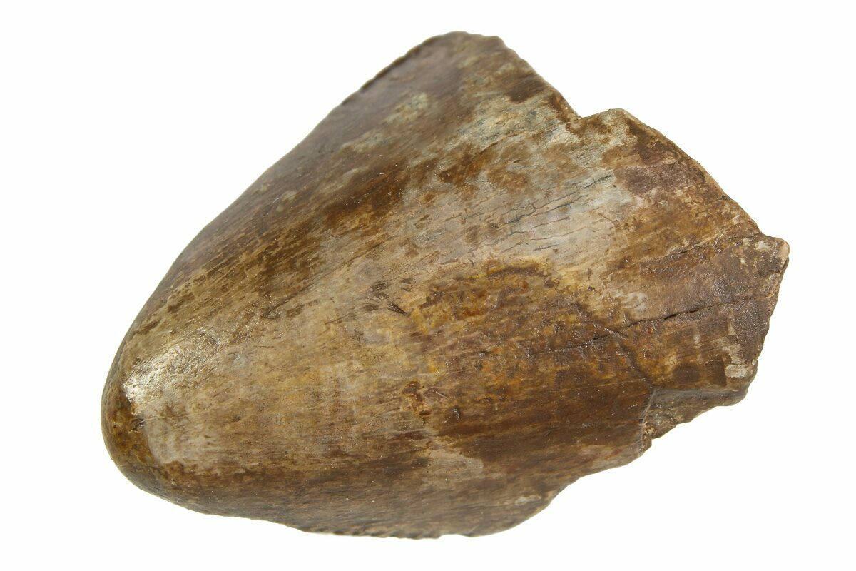True T. rex teeth are some of the most sought after and collectable fossils out there. When we get them in, they are typically sold within hours. This may only be the tip of the tooth, but it is still fascinating as is. It measures .90" long and has slightly worn but preserved serrations along both edges.