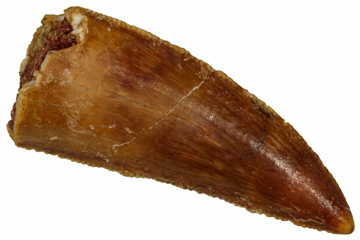 This is an authentic dinosaur tooth from the Late Cretaceous Kem Kem Beds (formerly Tegana Formation) of Morocco. These small theropod dinosaurs from the Tegana Formation have yet to be described, primarily due to a lack of articulated bone material found in the formation. That means it is impossible to provide a species or even genus ID from these teeth alone.