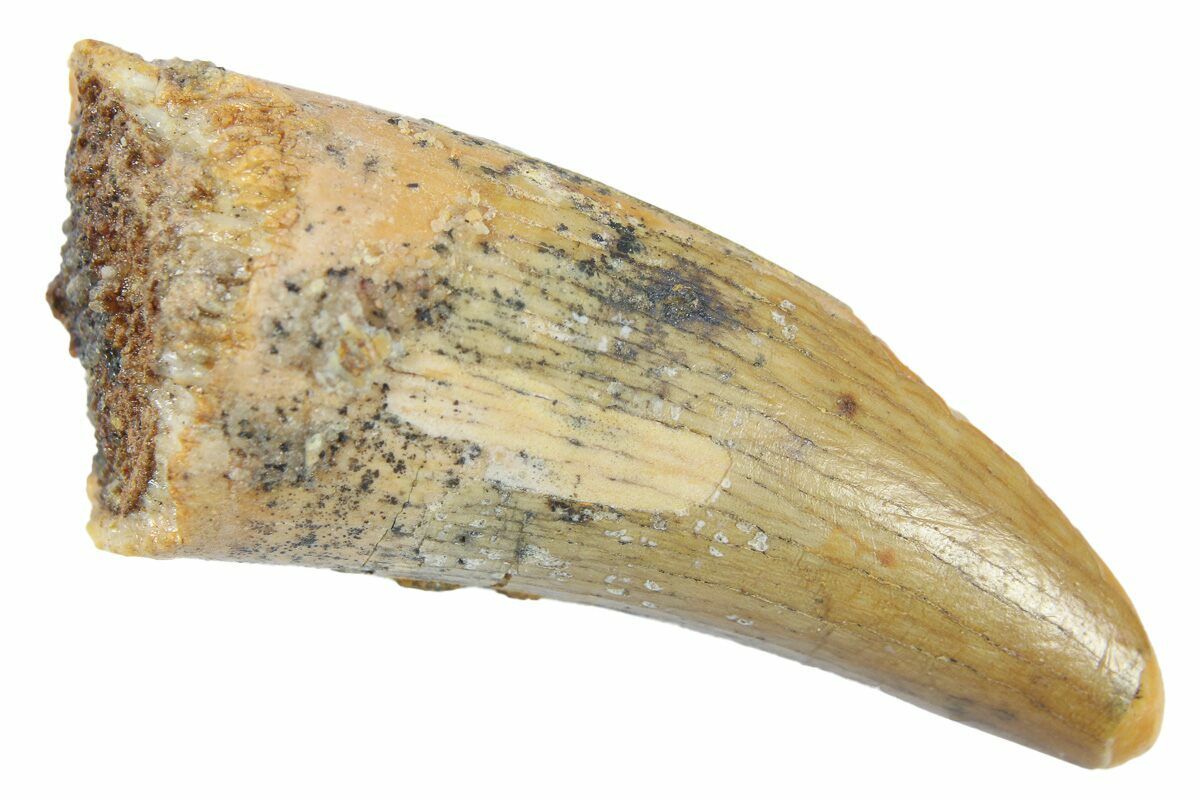 This type of tooth has a unique morphotype rarely found in the Kem Kem deposits. They usually measure between .5" and 1" long, have prominent serrations along the distal carinae, small serrations that are typically worn along the mesial carinae, and a very round base. The mid-line of their distal edge often contains an average of 14 to 17 serrations per 5mm, varying based on size of the tooth.
