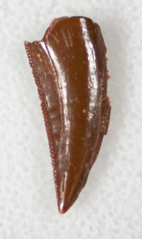 This is a real raptor tooth from the Late Cretaceous Kem Kem Beds (formerly Tegana Formation) of Morocco. These small theropod dinosaurs from the Tegana Formation have yet to be described, primarily due to lack of articulated bone material having been found. Because of this it's impossible to accurately give a species or even genus ID to these teeth. These teeth are most commonly attributed to a type of Dromaeosaur though it's also likely they from some type of Abelisauridae.