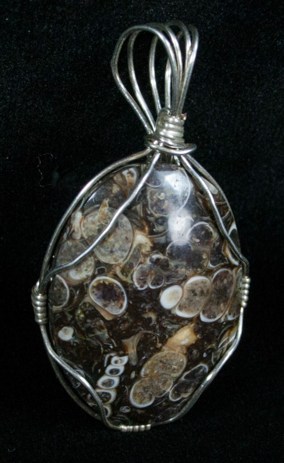 This is a beautiful, sterling silver, wire wrapped pendant made from polished rock containing agatized gastropod (snail) fossils. These fossils are Eocene in age or approximately 45-50 million years old. While they are typically referred to as Turritella, these ones are technically of the species Elimia tenera. Elimia is a genus of freshwater snail while Turritella lived in salt water.