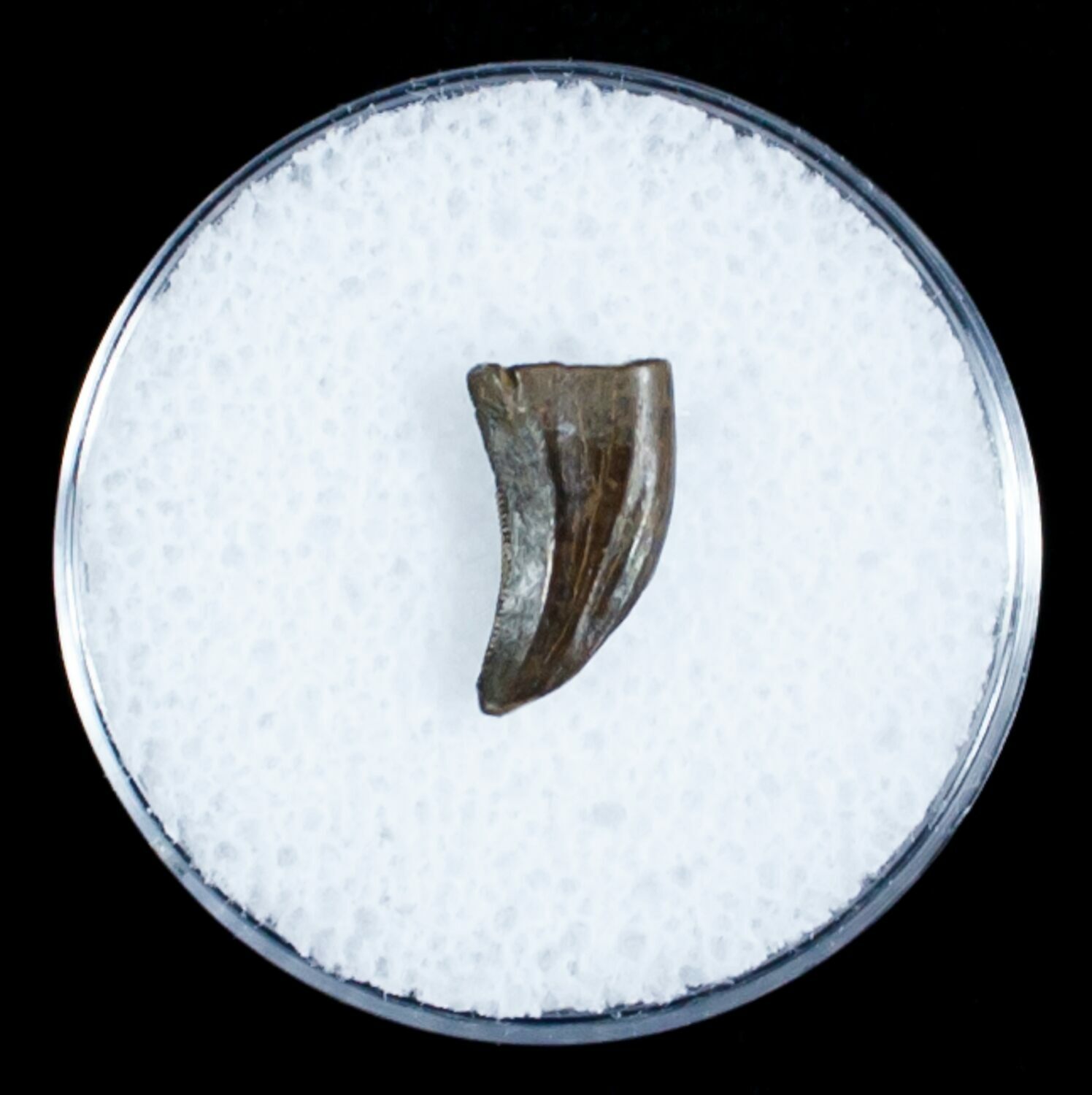 This is a small Dromaeosaurus (raptor) dinosaur tooth from the Hell Creek Formation of Montana. It has good great enamel preservation, some minor feeding damage to the tip and no restoration or repairs.