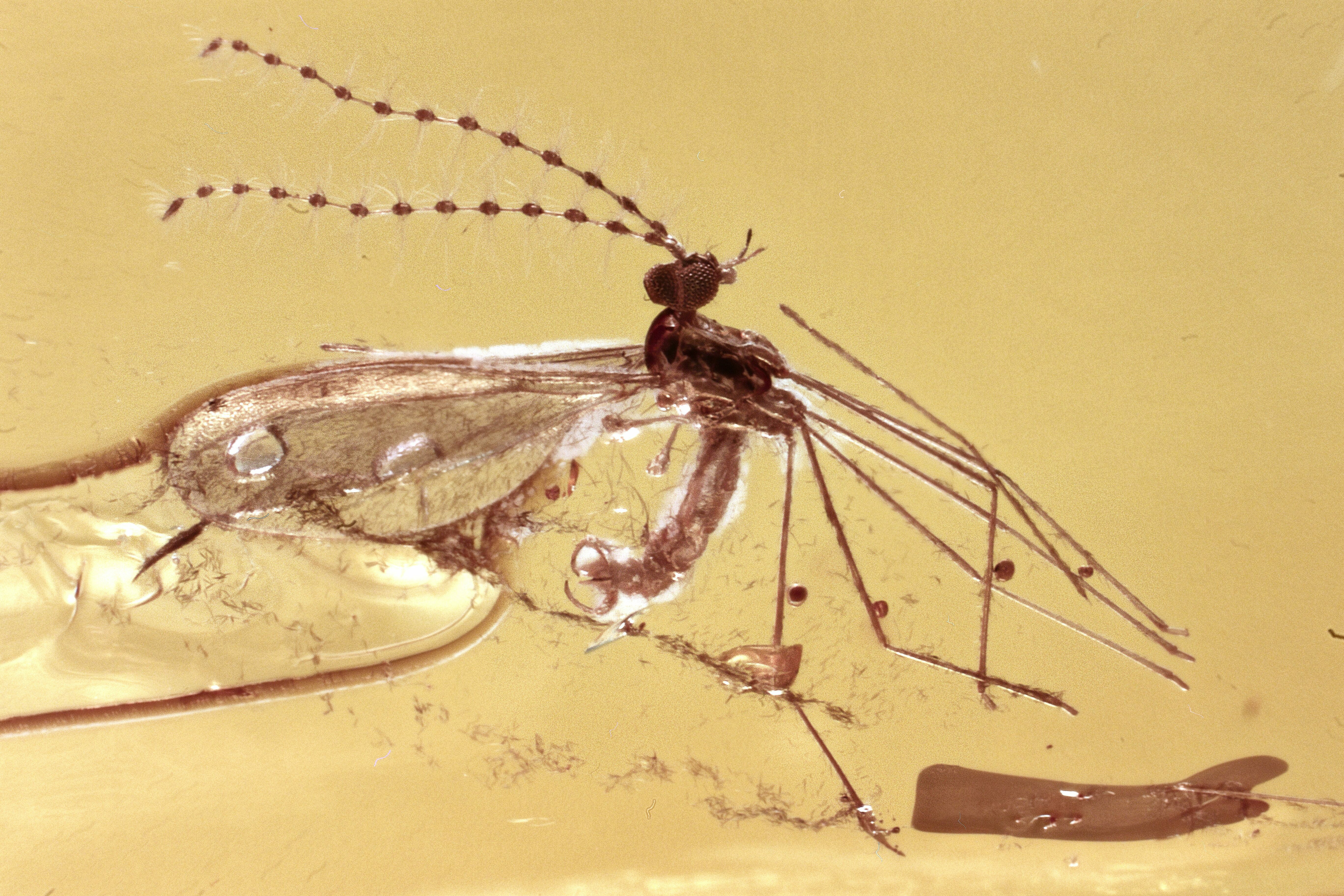 This is a small but detailed 44 million year old fossil gall midge (order Diptera - family Cecidomyiidae) preserved alongside two true midges (order Diptera - family Chironomidae) in Baltic amber.