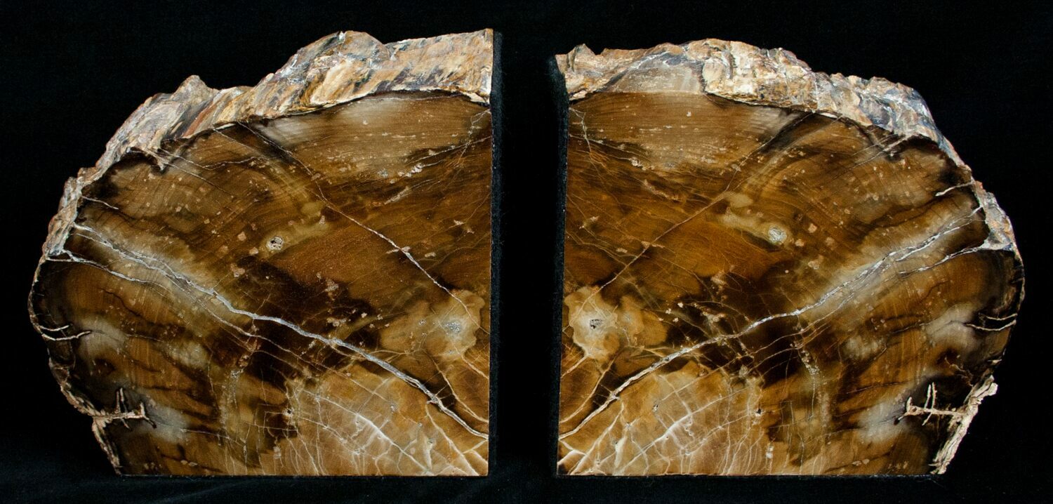 This is a beautiful pair of large bookends made from petrified wood found near Ashwood, Oregon. Each bookend weights approximately 4 pounds and is 5 inches tall and 5 inches deep and 1 1/2 inches wide. The wood is Eocene aged (50 million years) and identified as a species of Sequoia.