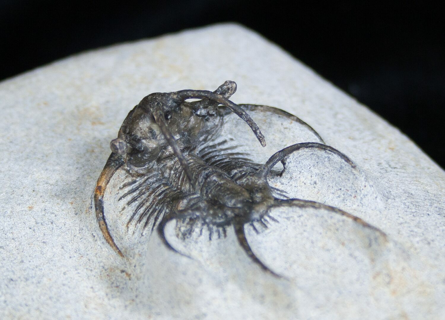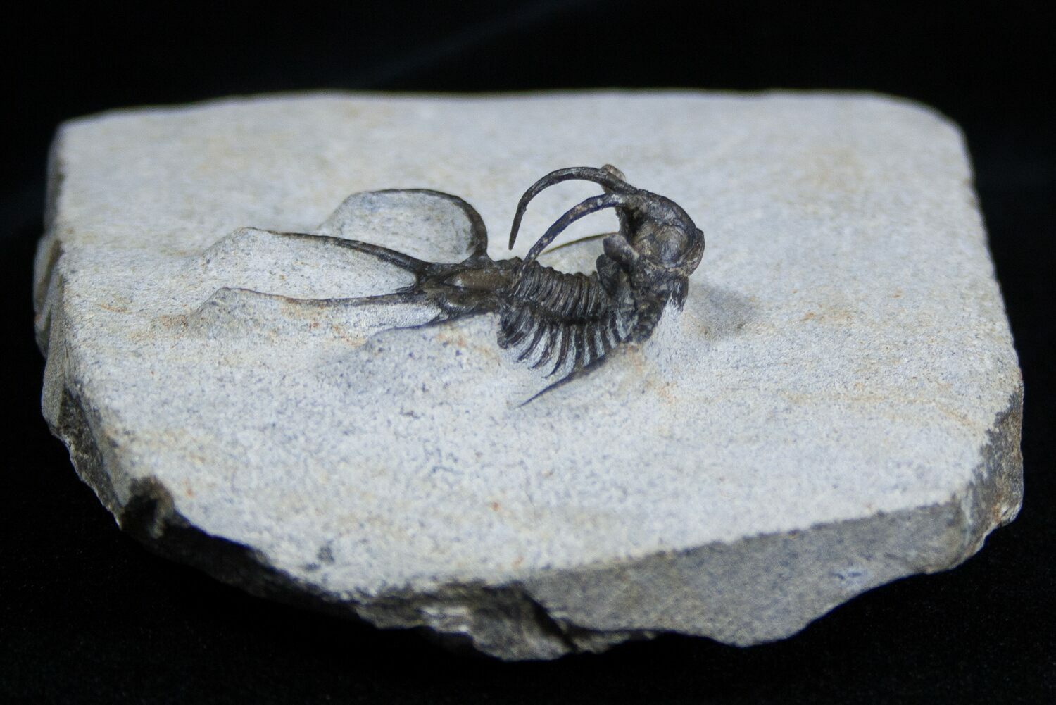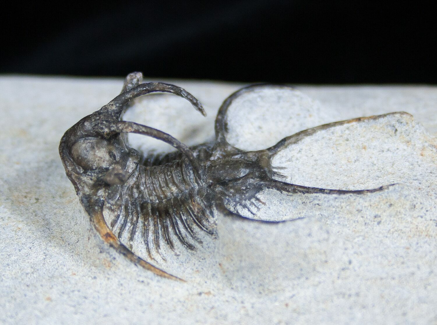 This is a small Ceratarges armatus trilobite from the Middle Devonian limestone near Jbel Issoumour, Morocco. It has been prepared with free-standing spines and eye stalks and has no restoration.