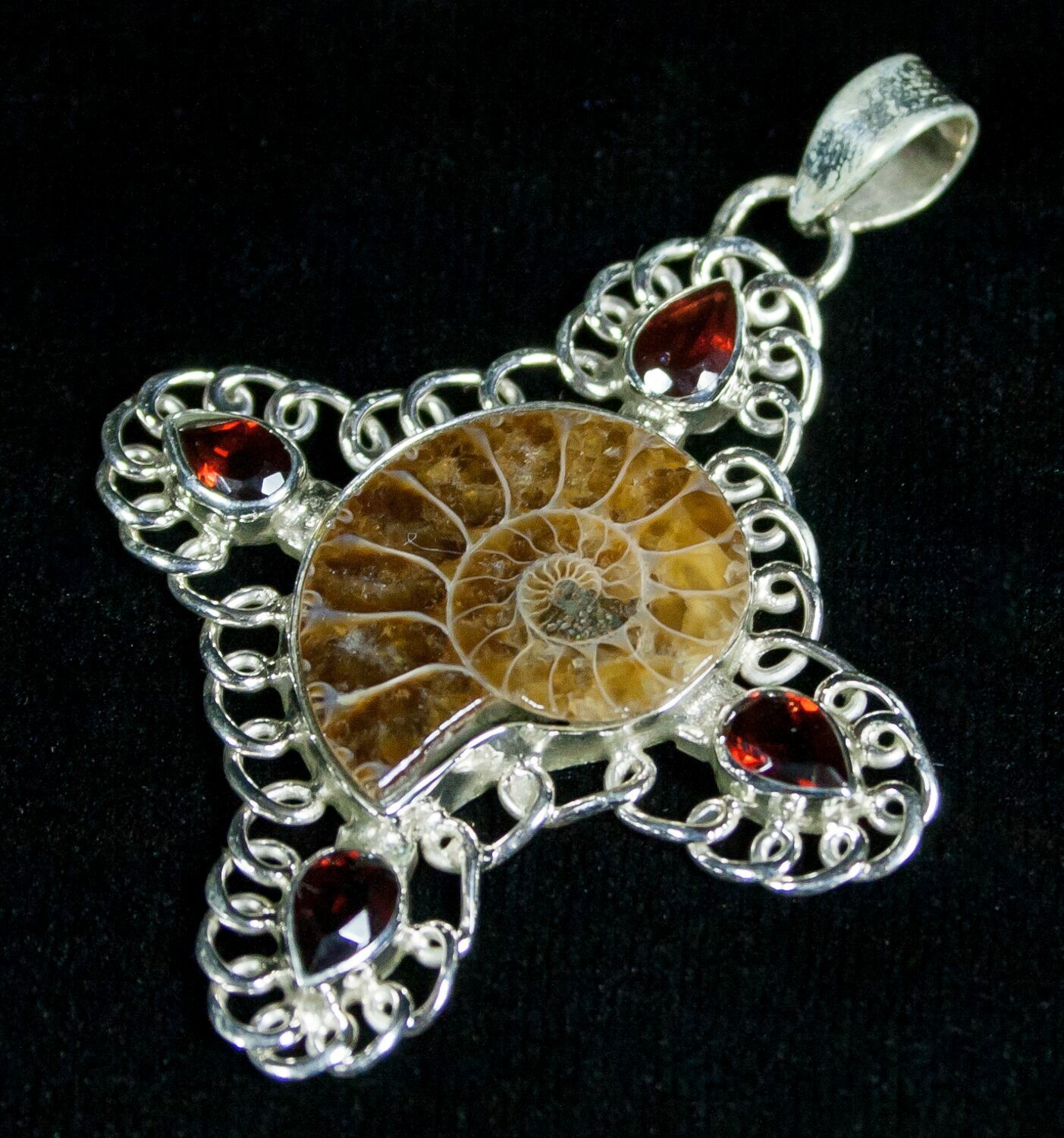 This is a unique pendant featuring a real 110 million year old cut and polished ammonite fossil from Madagascar. The one-of-a-kind piece was hand crafted using 925 sterling silver.