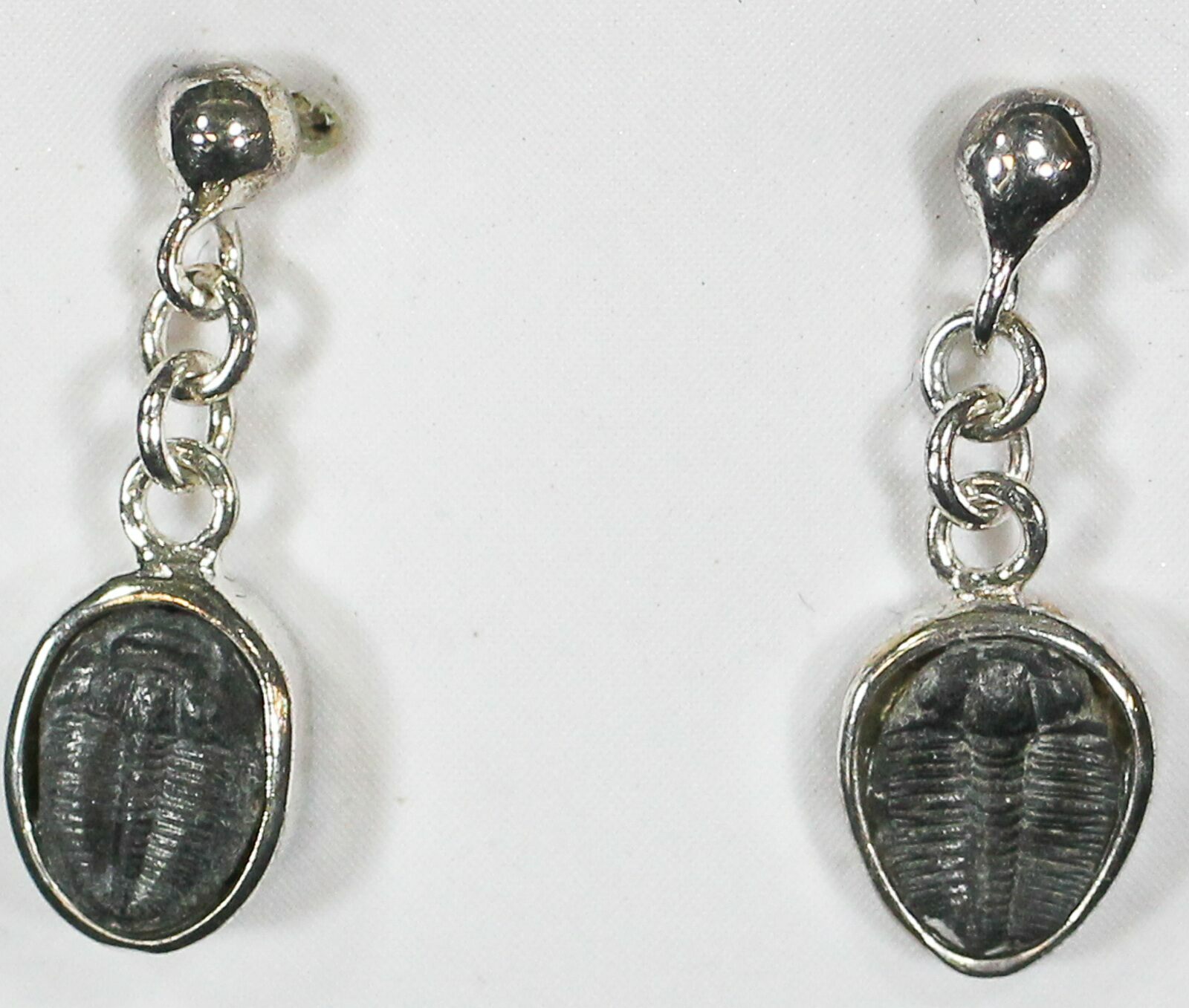 This is a pair of finely crafted, sterling silver earrings featuring authentic Elrathia kingii trilobite fossils. These trilobites are 505 million years old and come from the Wheeler Shale of Western Utah. Trilobites are an extinct marine arthropod that dominated the seas for over 200 million years. They had a hard shell which is commonly preserved as a fossil.