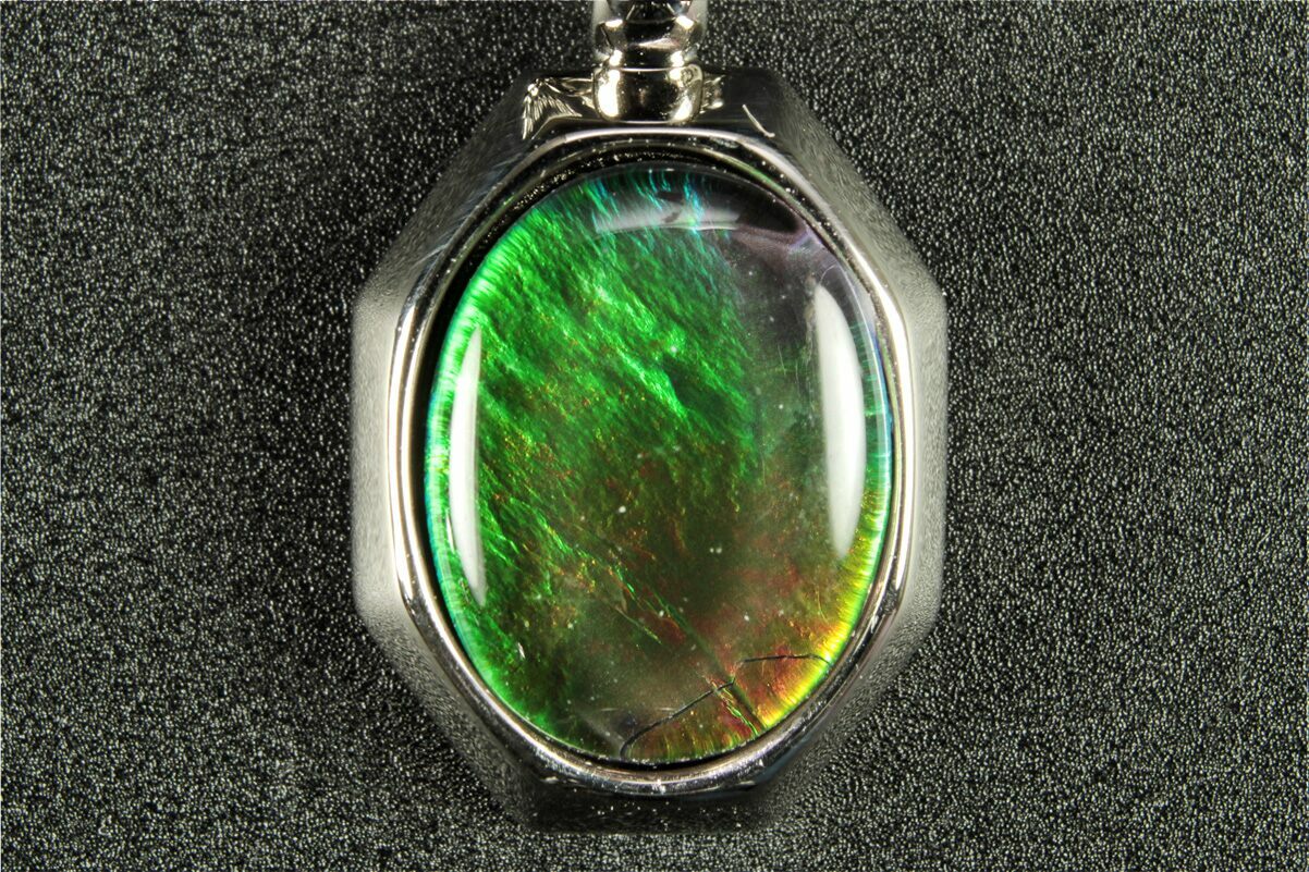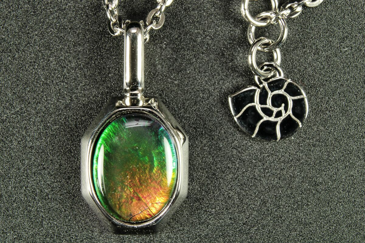 This is a beautiful Alberta ammolite pendant (oval) set in 925 sterling silver. Only the highest quality ammolite is chosen for use in this unique piece of jewelry. The ammolite displays flashy green, orange, and red coloration.