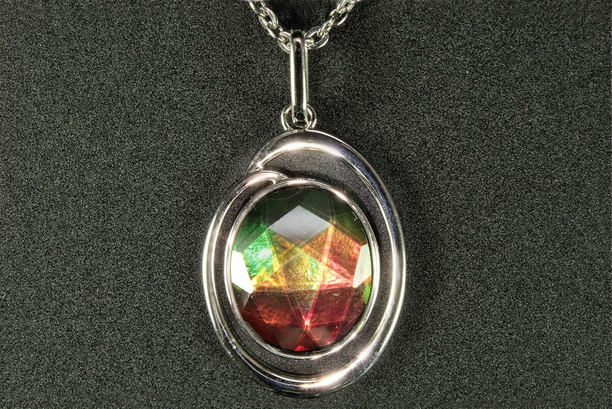 This is a beautiful Alberta ammolite pendant (oval) set in 925 sterling silver. Only the highest quality ammolite is chosen for use in this unique piece of jewelry. The ammolite displays flashy green, orange, and red coloration.