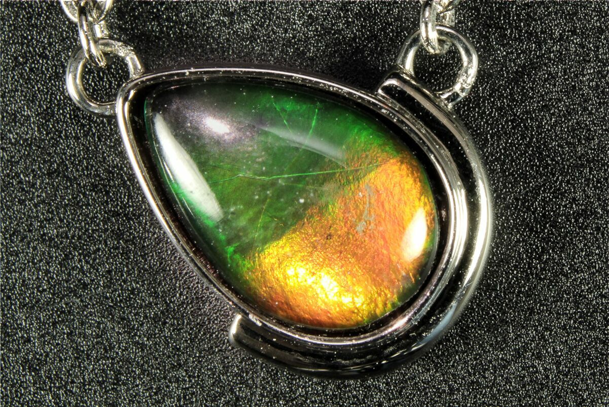 This is a beautiful Alberta ammolite pendant (teardrop) set in 925 sterling silver. Only the highest quality ammolite is chosen for use in this unique piece of jewelry. The ammolite displays flashy green, orange, and red coloration.