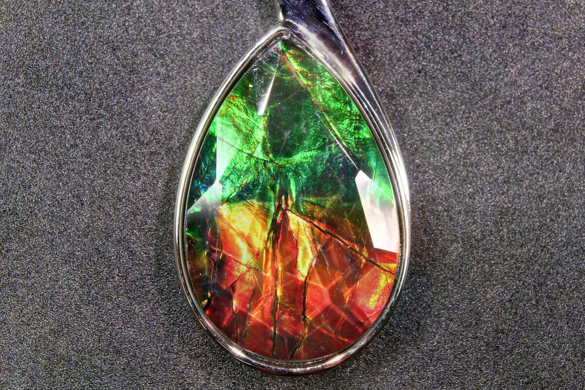 This is a beautiful Alberta ammolite pendant (teardrop) set in 925 sterling silver. Only the highest quality ammolite is chosen for use in this unique piece of jewelry. The ammolite displays flashy green, orange, and red coloration.