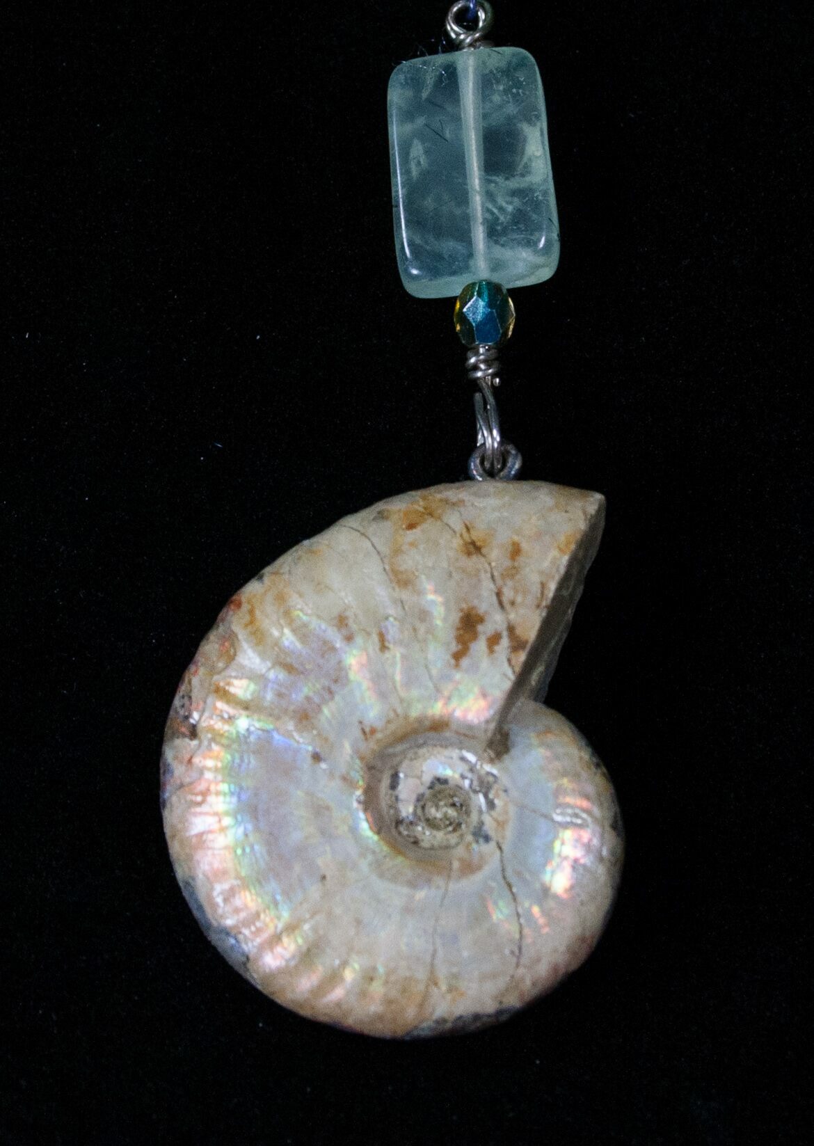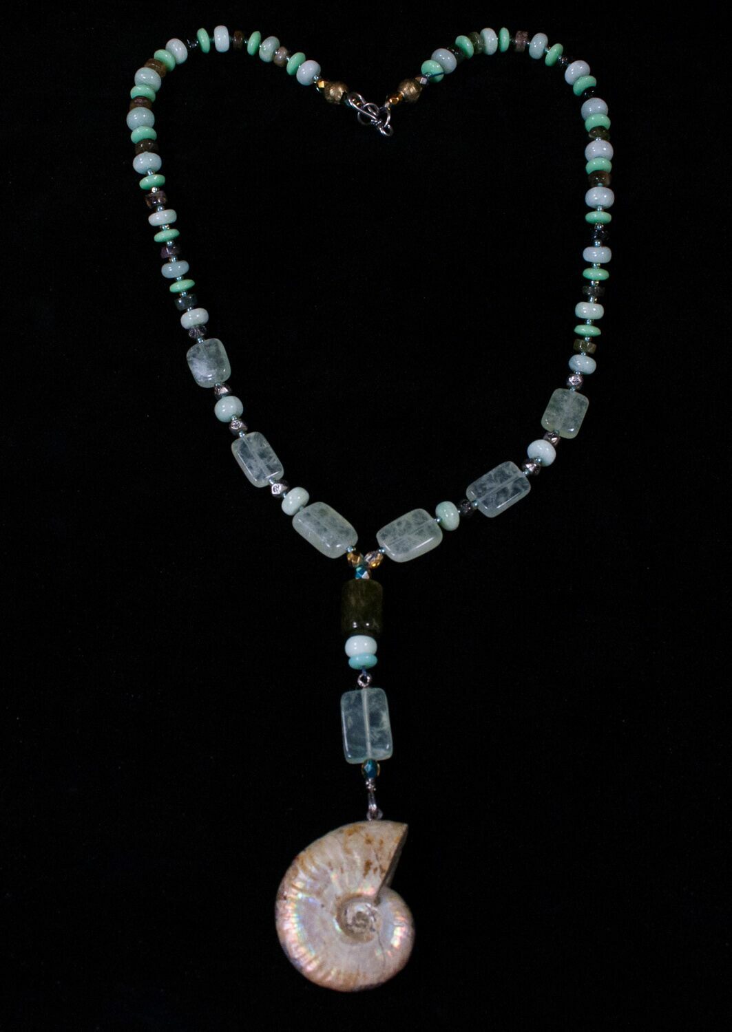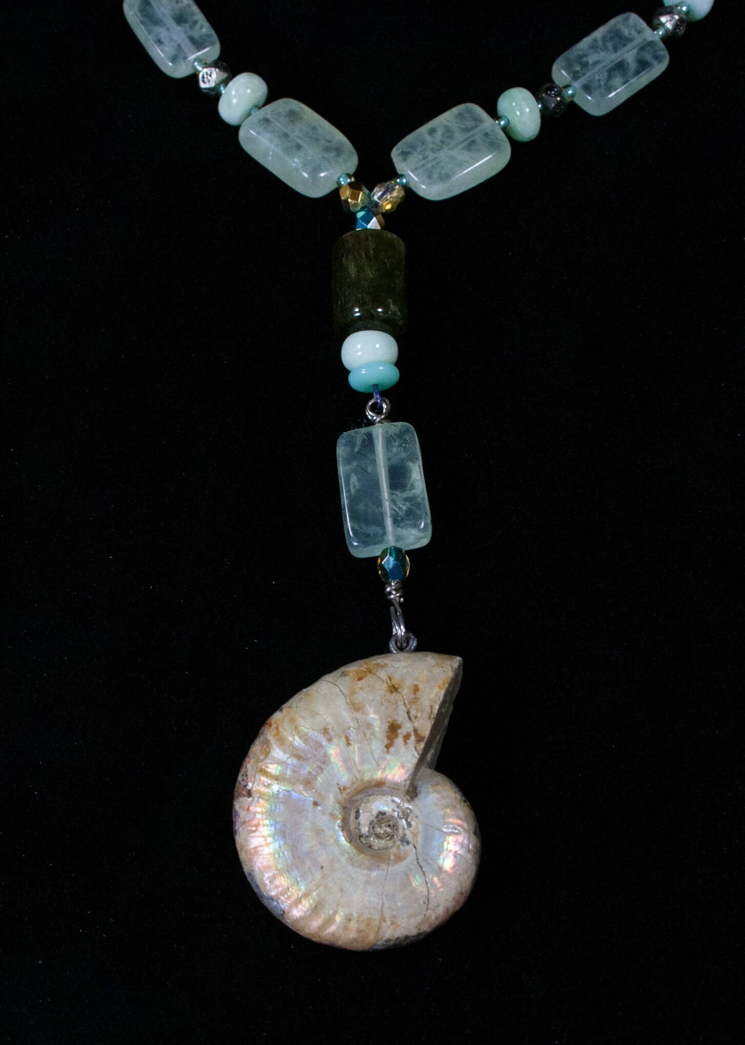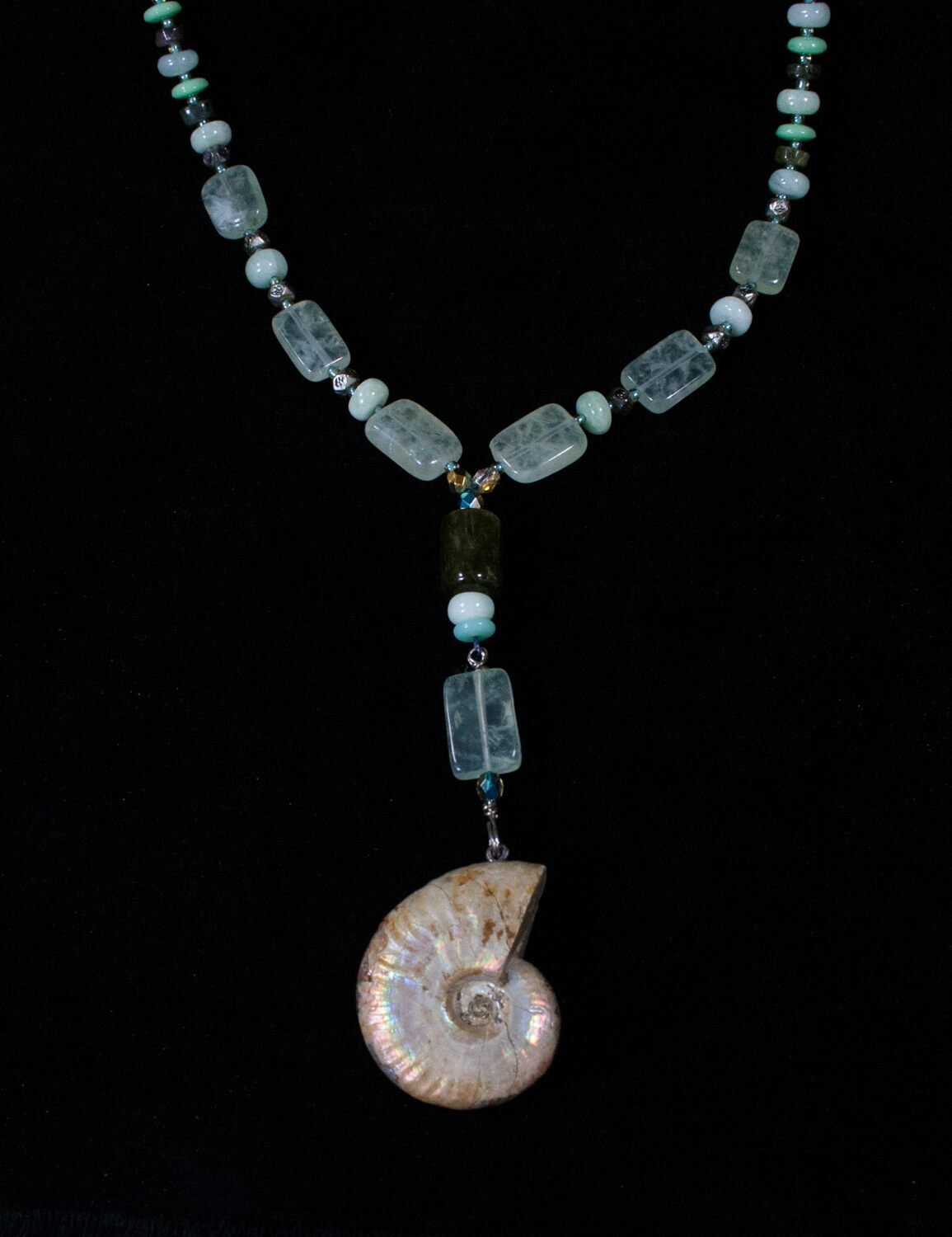 This is a stunning, hand-made necklace featuring a 70 million year old, iridescent ammonite fossil from South Dakota. Most of the beads on this wonderful piece of jewelry are green quartz with tourmaline, and there is a deep green tourmaline barrel at the base of the necklace.