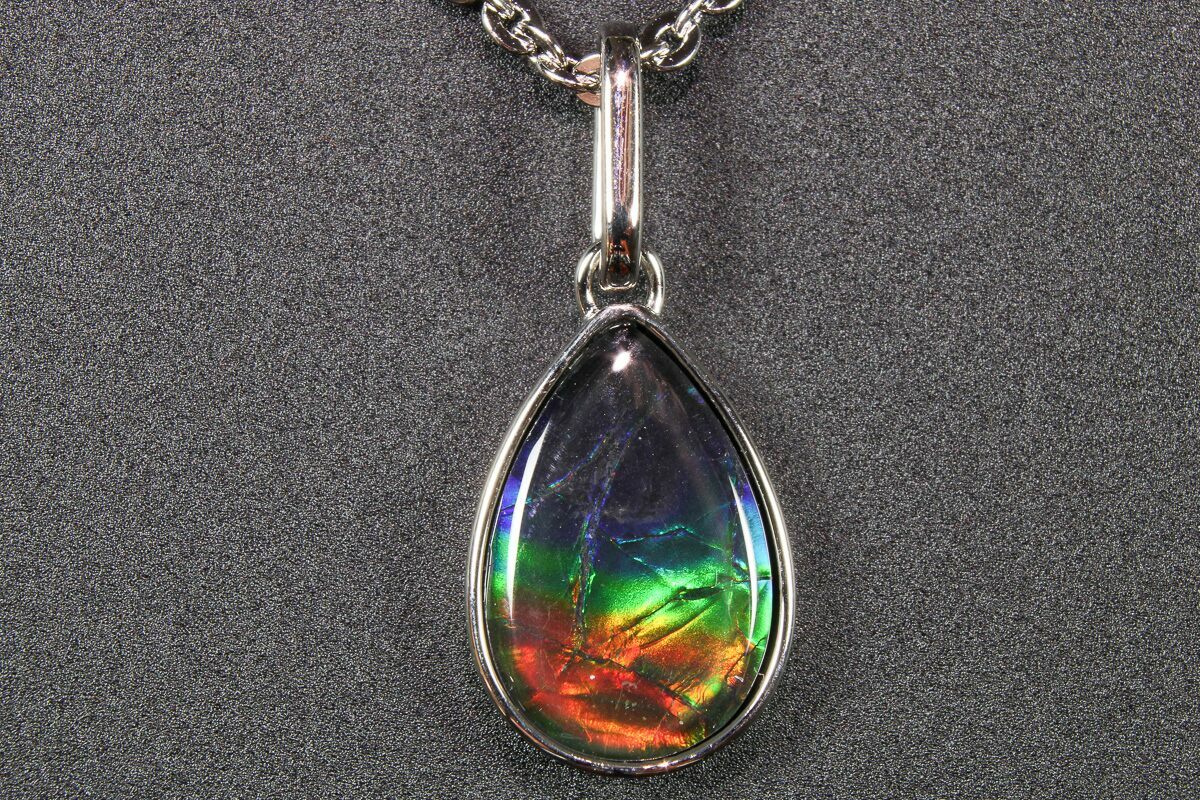 This is an absolutely stunning Alberta ammolite pendant (pear) set in 925 sterling silver. Only the highest quality ammolite is chosen for use in this unique piece of jewelry. The ammolite displays flashy blue, green, orange, and red coloration.