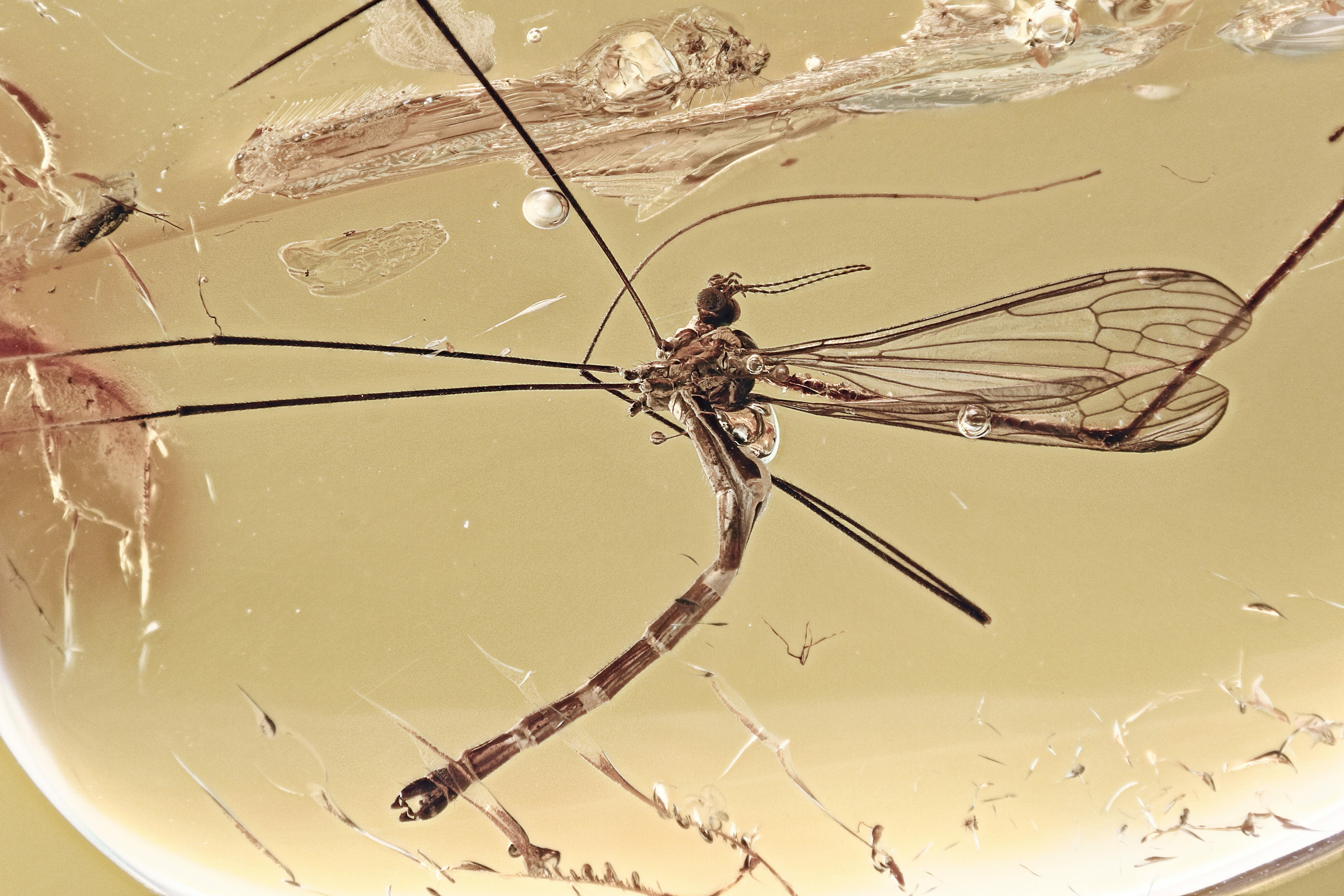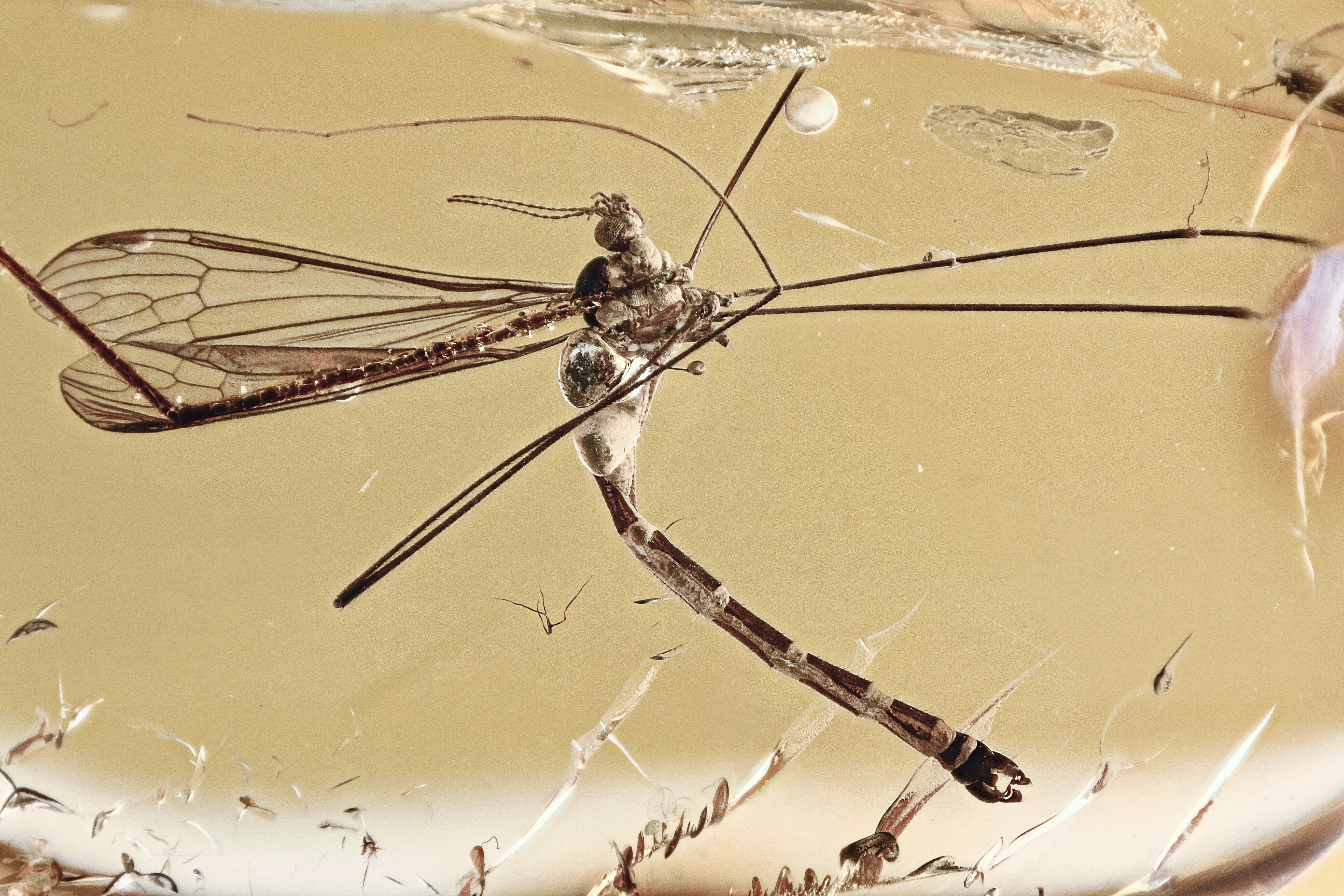 This piece of 44 million year old Baltic amber contains a beautifully preserved crane fly from the subfamily Limoniidae. The crane fly measures approximately 21.5mm (including legs) long.