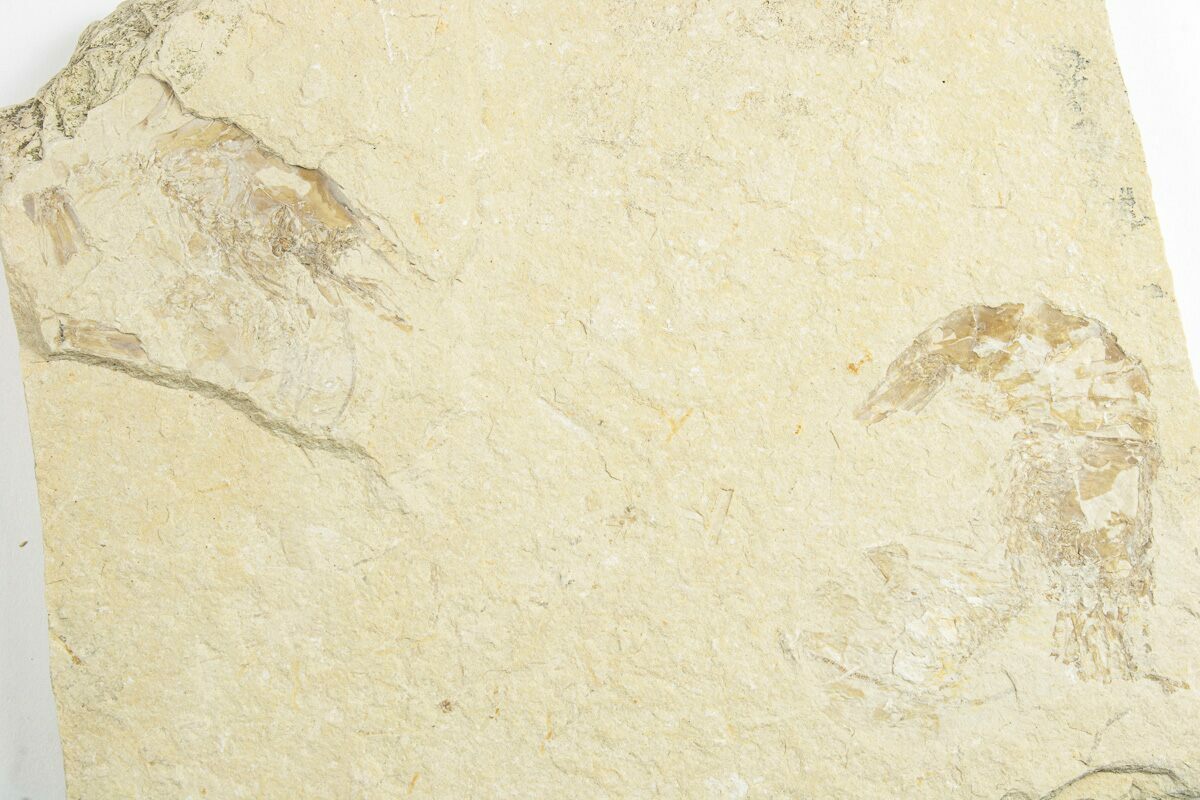 These are three fossil shrimp from Hjoula, Lebanon. The largest shrimp is 1.5" long including antennae. The fossils have preserved carapaces, legs, and antennae.