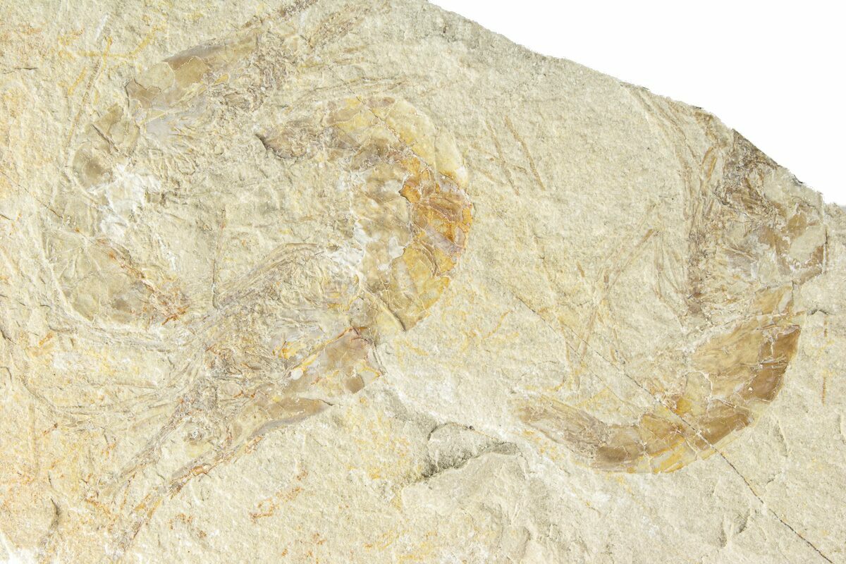 These are three fossil shrimp from Hjoula, Lebanon. The largest shrimp is 2.0" long including antennae. The fossils have preserved carapaces, legs, and antennae. Black dendrites cover portions of the fossils.
