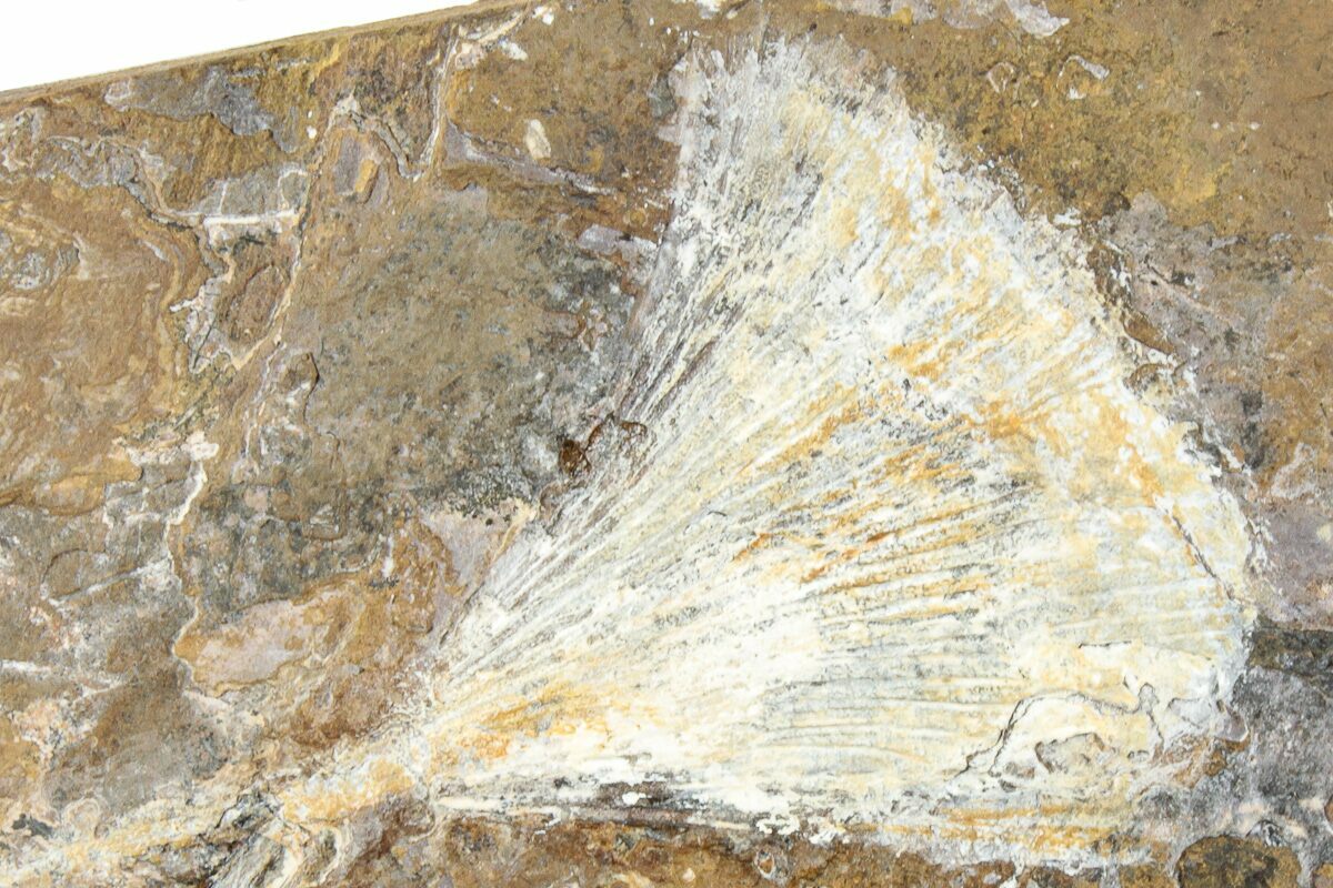 This is a beautiful association of fossil Ginkgo leaves (Ginkgo cranei) from the Sentinel Butte Formation of North Dakota. They are finely detailed and the light preservation contrasts well against the dark orangish-brown rock.
