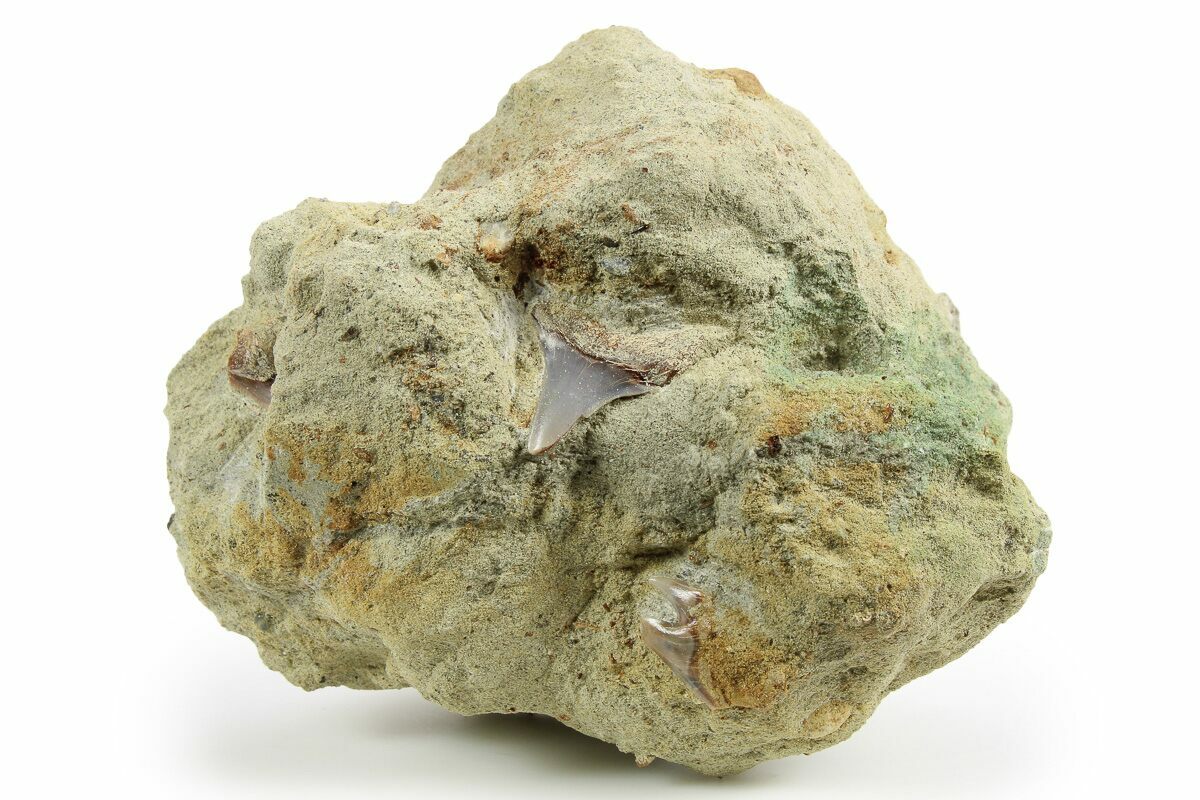 The teeth have been exposed from the sandstone they were found in. Additional bones can be found scattered throughout the sandstone as well. The slight green tint of the sandstone is a result of the stabilization process.