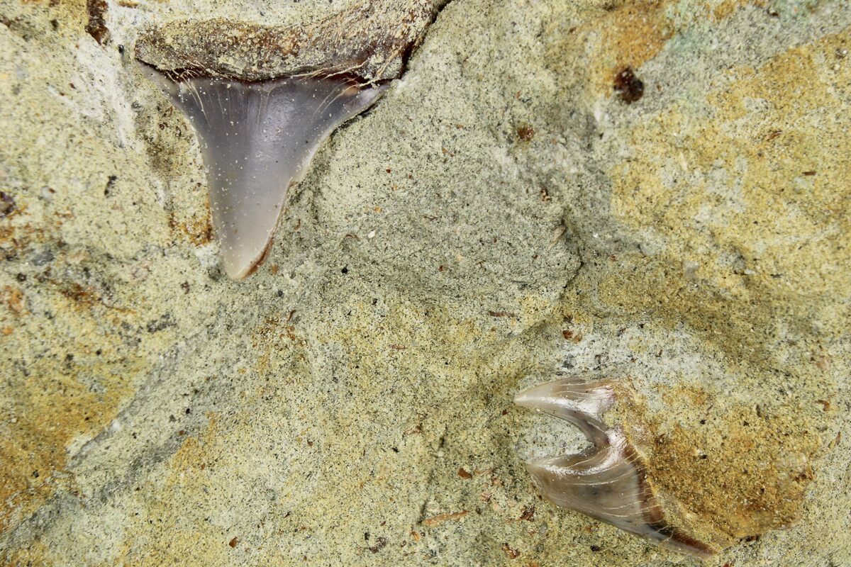Three Fossil Shark Teeth on Sandstone - Bakersfield, CA