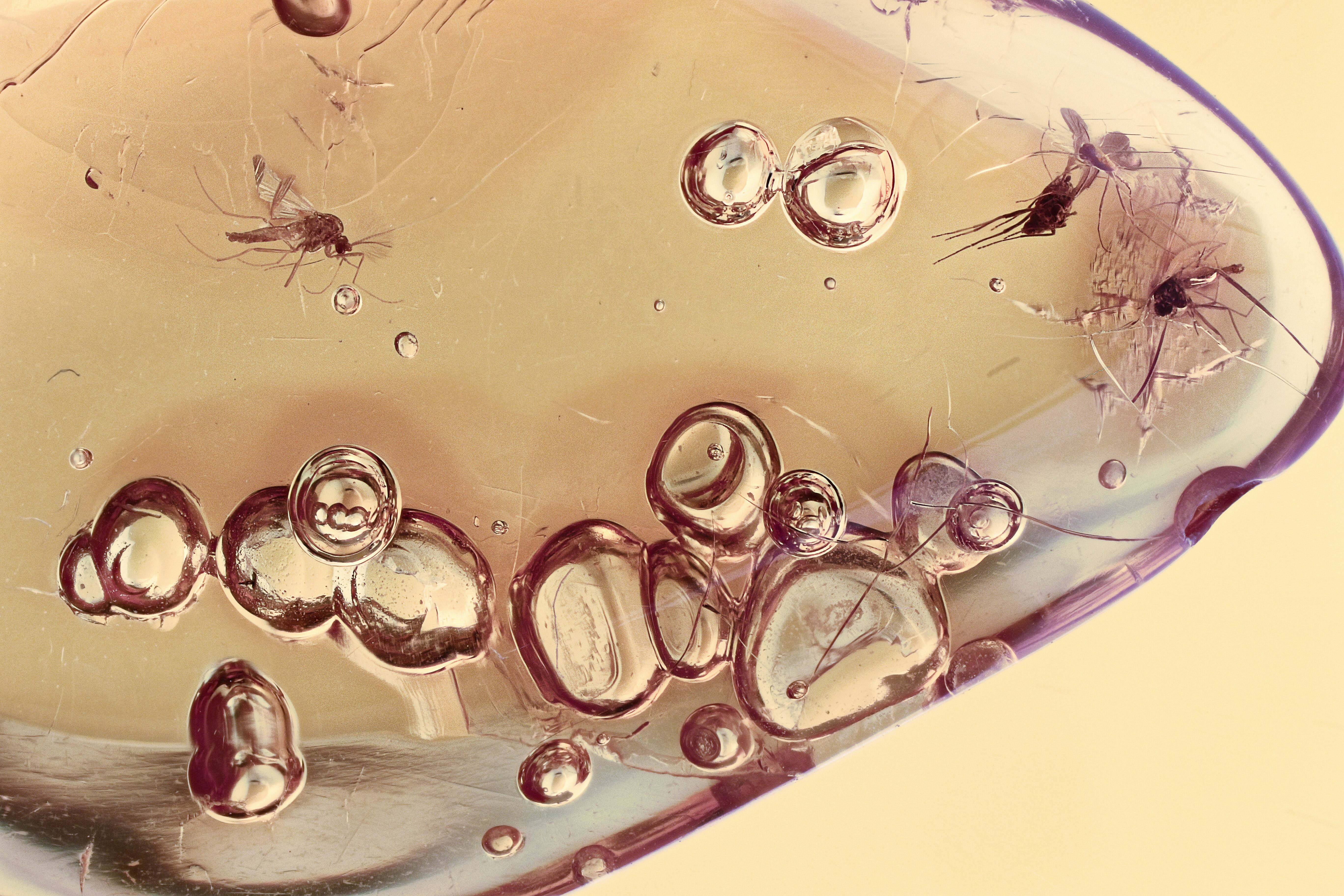 These are three small but detailed, 44 million year old fossil true midges (order Diptera - family Chironomidae) surrounded by bubbles, preserved in Baltic amber. This largest midge is about 1.2mm long including appendages.