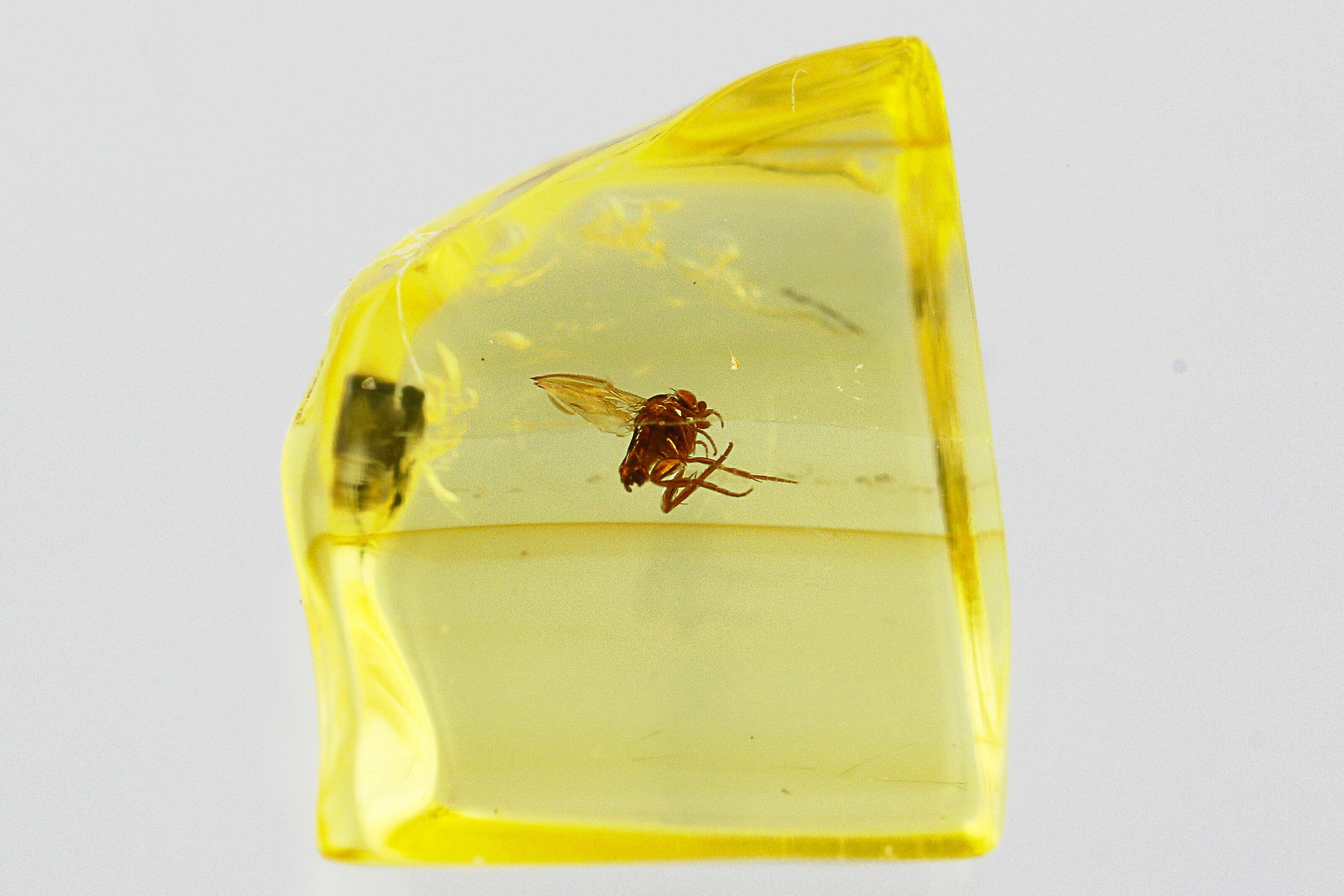 This is a tiny, 44 million year old fossil scuttle fly (order Diptera - family Phoridae) preserved in a jewelry-sized piece of Baltic amber. Including its appendages, the fly measures approximately 2mm long.