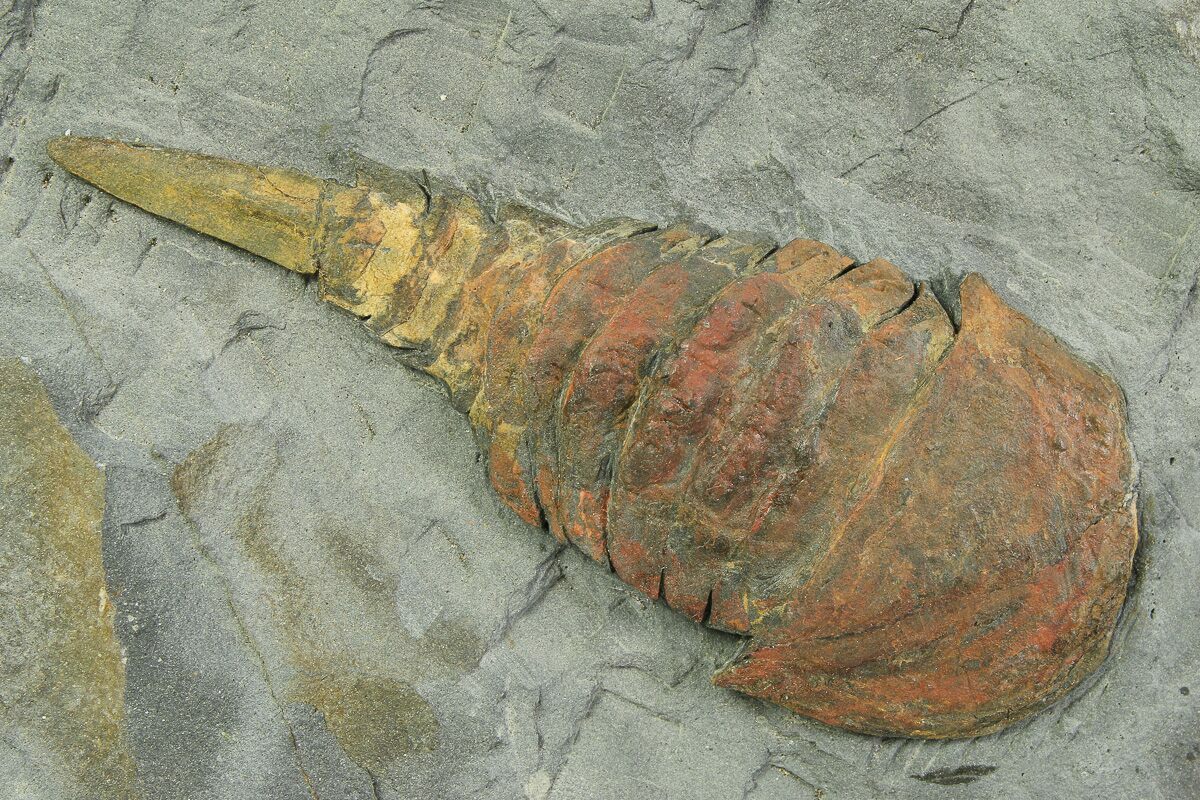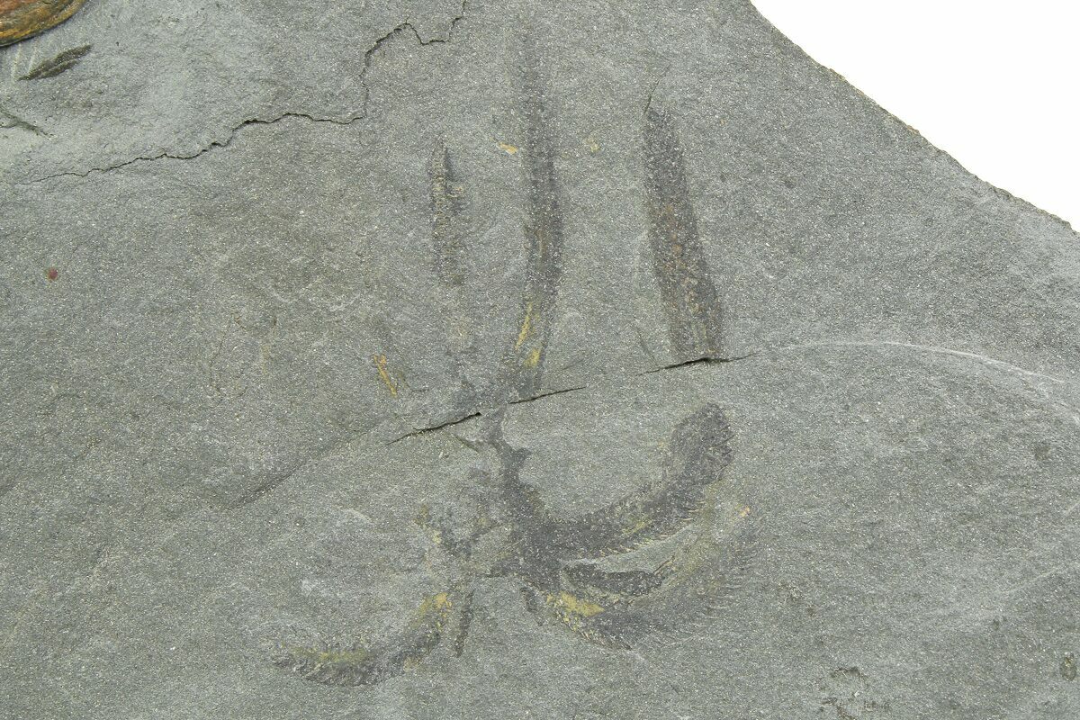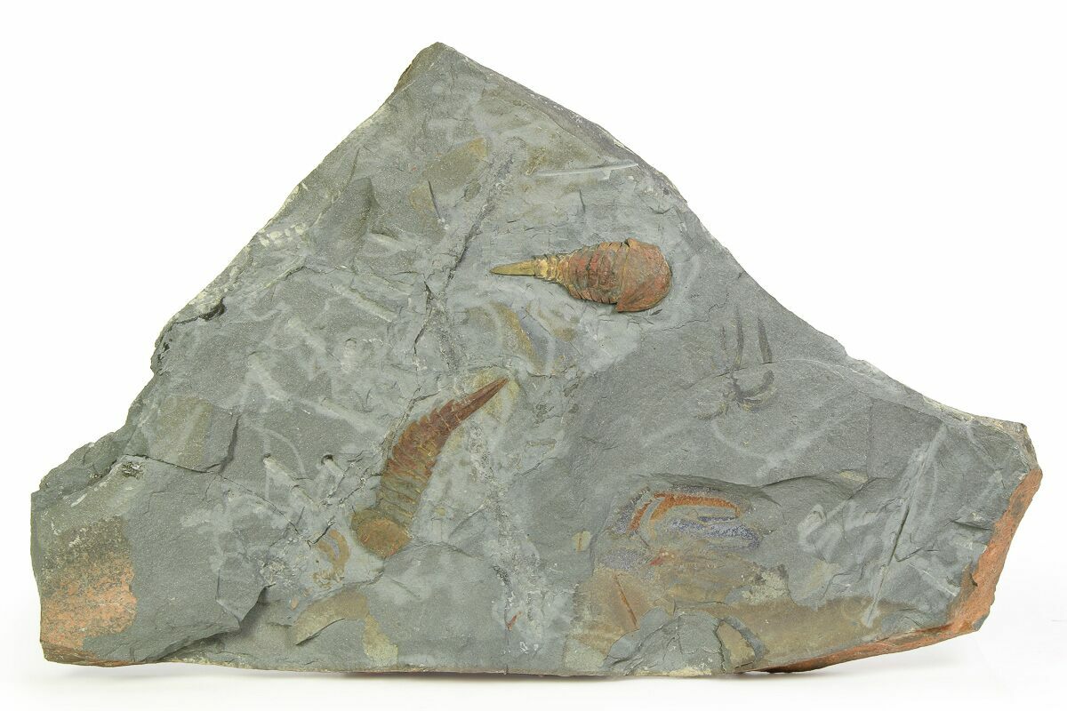 This is an awesome association of two types of Lower Ordovician soft-bodied arthropods. There are a pair of Aglaspids (Tremaglaspis) as well as a pair of faintly preserved Marrellomorphs (Furca mauretanica) on a 15.5 x 9" piece of shale.