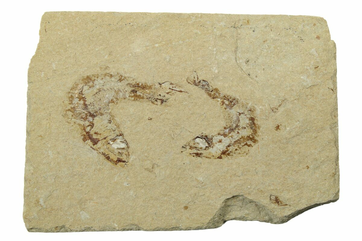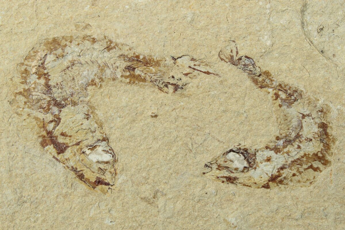 Here are two fossil fish from the Upper Cretaceous marine deposits near Hakel, Lebanon. There are dozens of species of fish described from these deposits which makes identification difficult. Given that the preservation of these fossils is a top-down view it makes identification even more difficult, though the most likely candidates are of the genera, Armigatus and Scombroclupea.