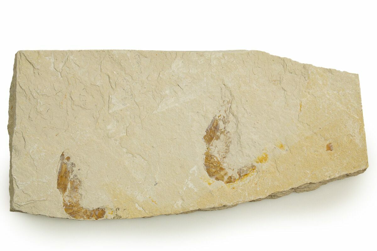 These are two fossil shrimp from Hjoula, Lebanon. The largest shrimp is 1.1" long. The fossils have preserved carapaces and legs.