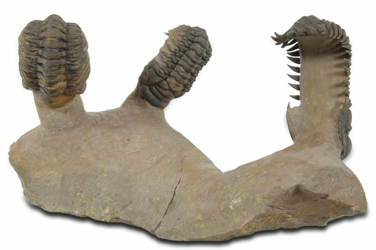 This specimen is a naturally associated cluster of three trilobites from Atchana, Morocco, representing two distinct species. It includes a pair of Crotalocephalina gibbus, with the larger measuring approximately 3.5 inches in length, along with a single Reedops. The piece has been skillfully prepared to enhance its visual appeal, with most of the surrounding limestone removed. Total restoration is less than 1%.