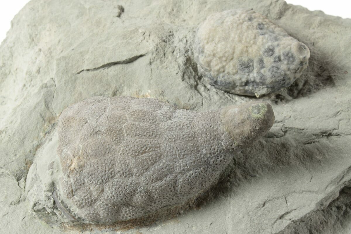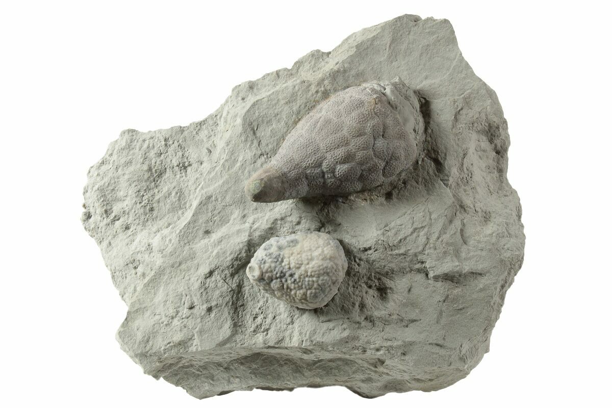 This is a 6.3" wide shale piece that contains two cystoid (Holocystites scutellatus) fossils, collected from the Silurian period Osgood Shale of Napolean, Indiana. They have been prepped free from the rock using air abrasives, and remounted back to this rock.